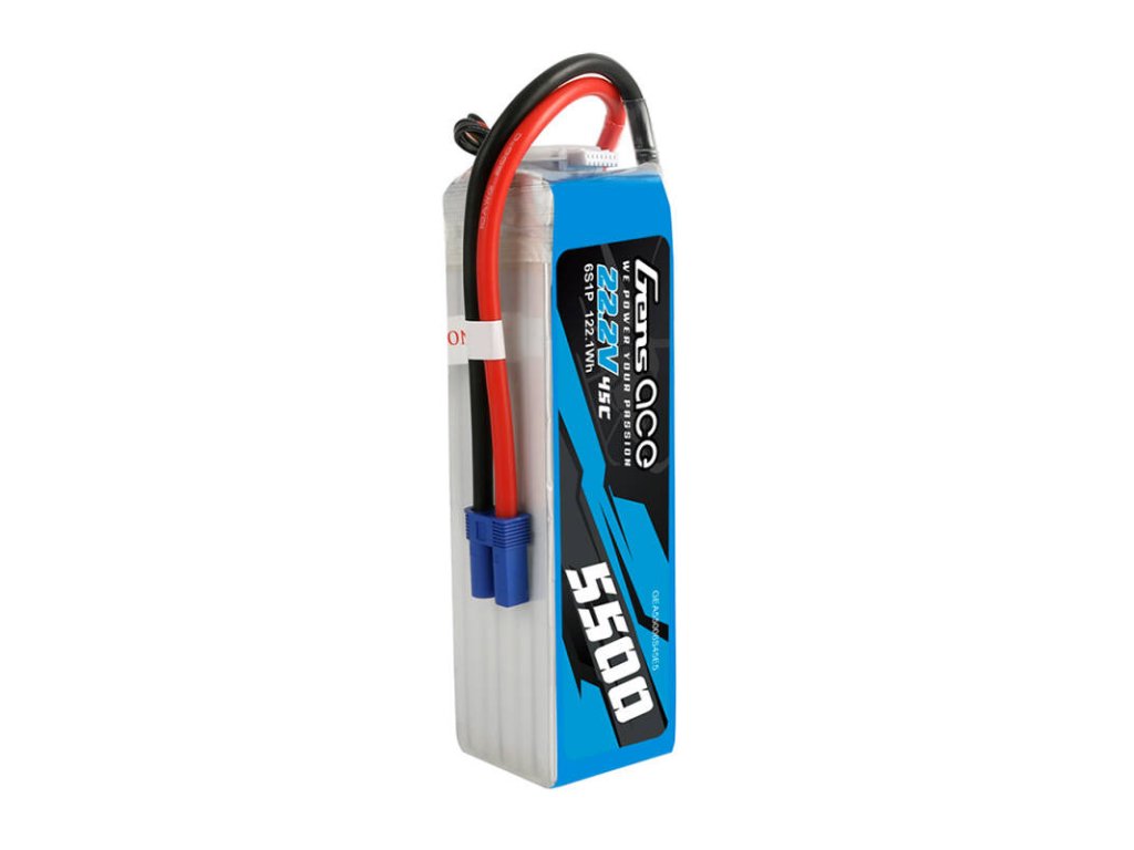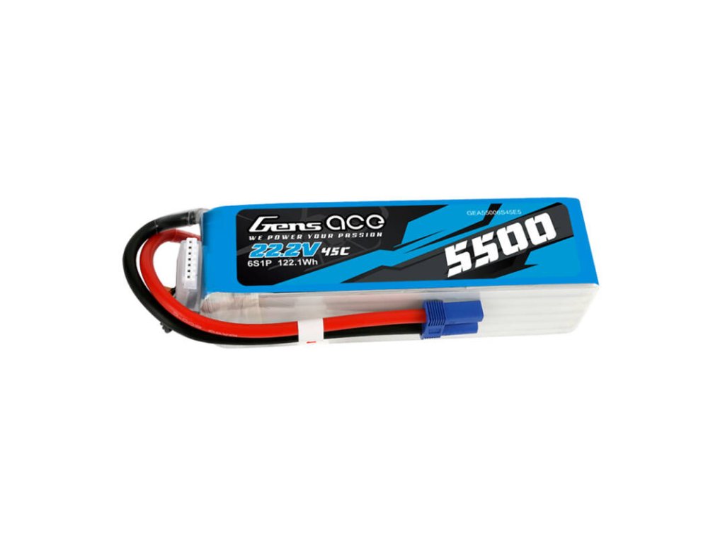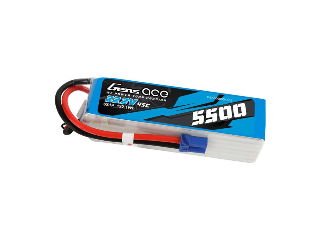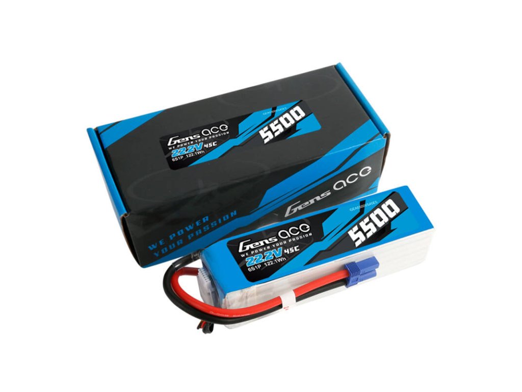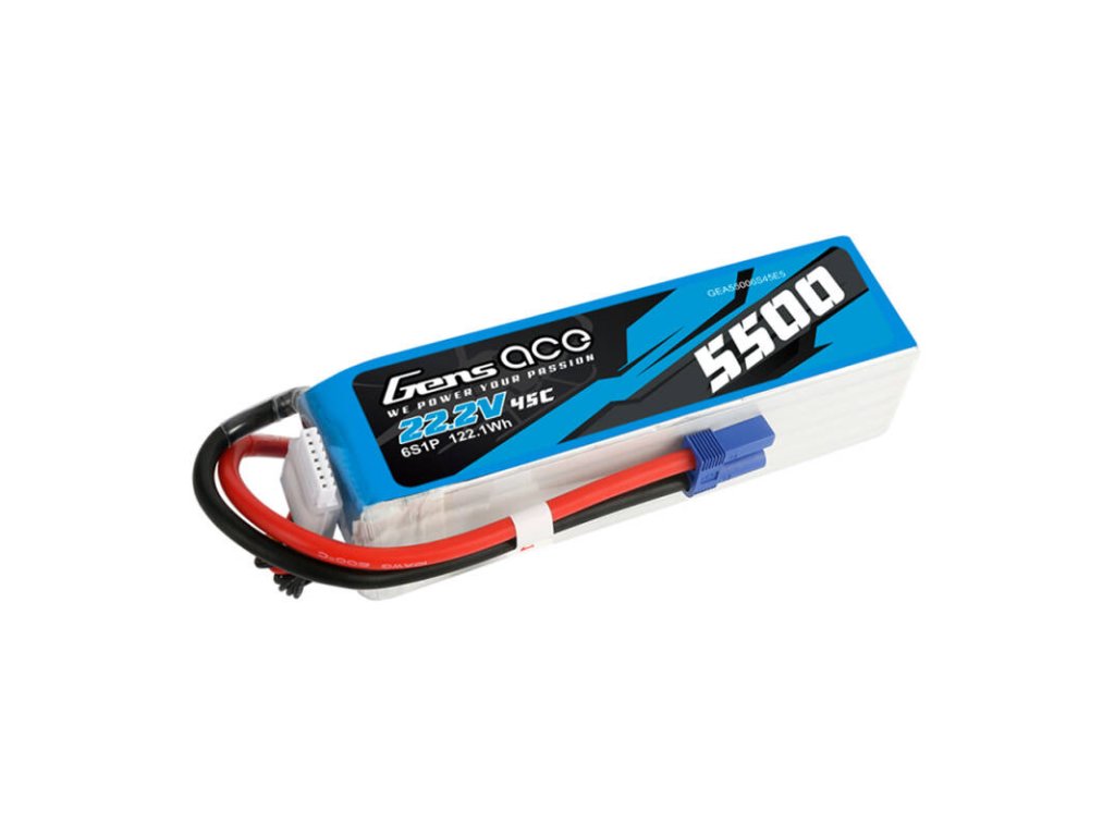 Bateria Gens Ace a fost creată având în vedere modelele de elicoptere. Cu o capacitate de 5500 mAh și o tensiune de 22,2 V, oferă energie de lungă durată pentru sesiuni de zbor mai lungi. Cu o descărcare continuă maximă de 45C (261A) și o descărcare maximă prin salt de 90C (522A), produsul garantează o furnizare lină și stabilă de energie chiar și în condiții intensive. Conectorul de echilibru de tip JST-XHR și conectorul de descărcare de tip EC5 asigură o funcționare simplă și sigură.
