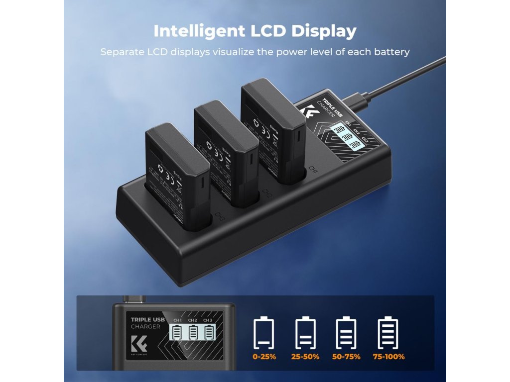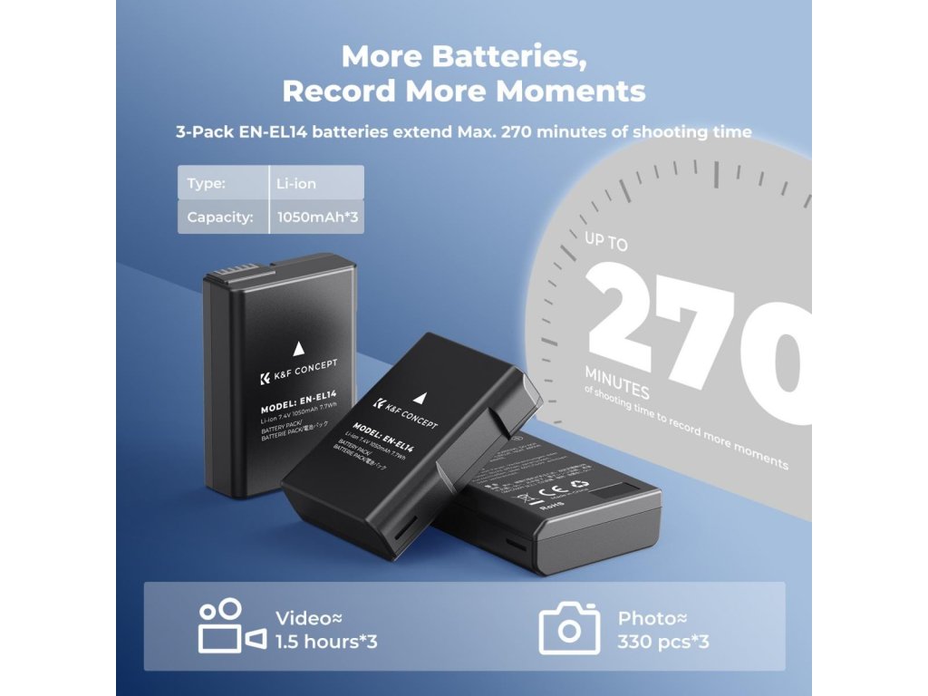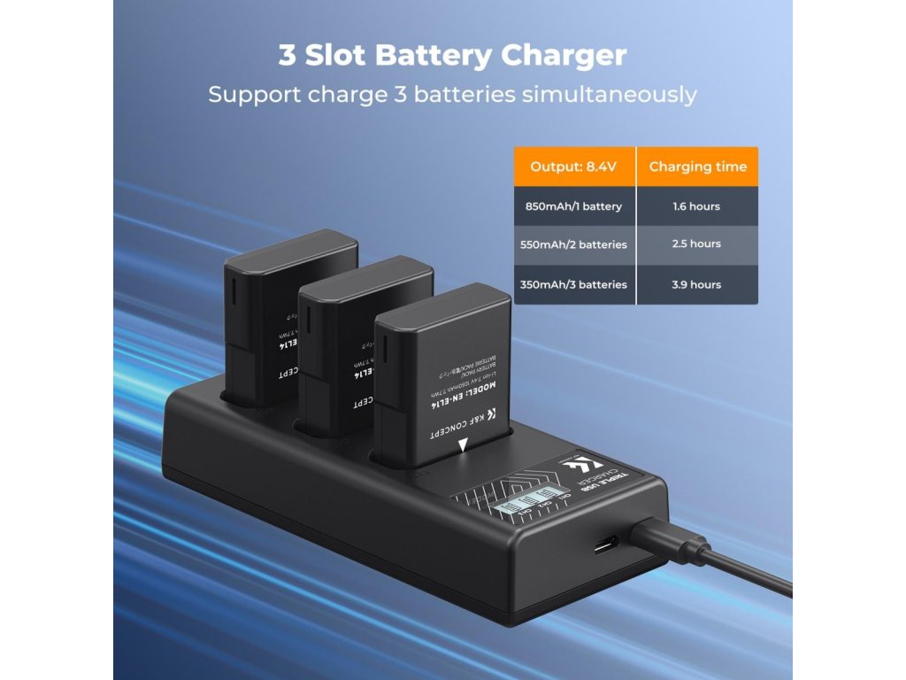 Acumulator K&F Concept pentru Nikon EN-EL14 1050 mAh, pachet de 3 + încărcător, set încărcător pentru afișaj LCD, cu trei sloturi