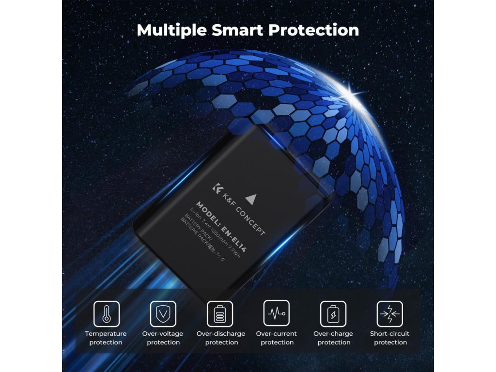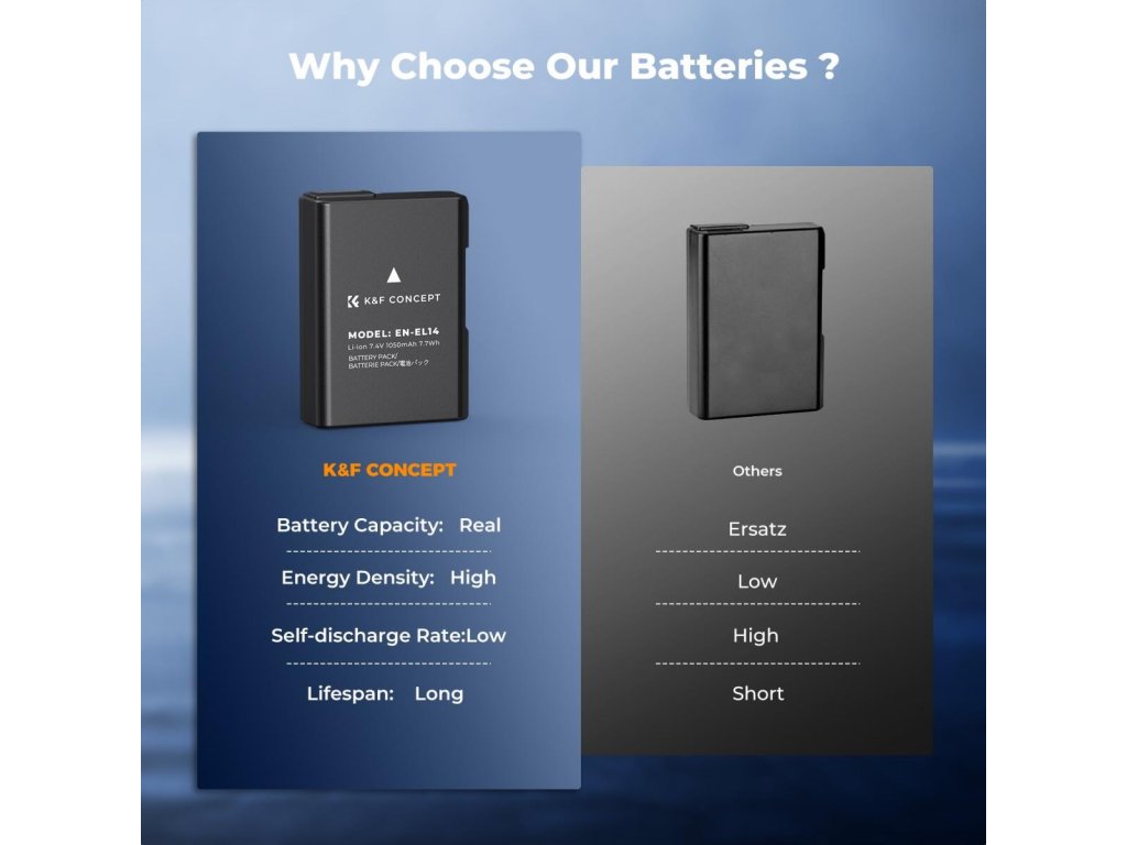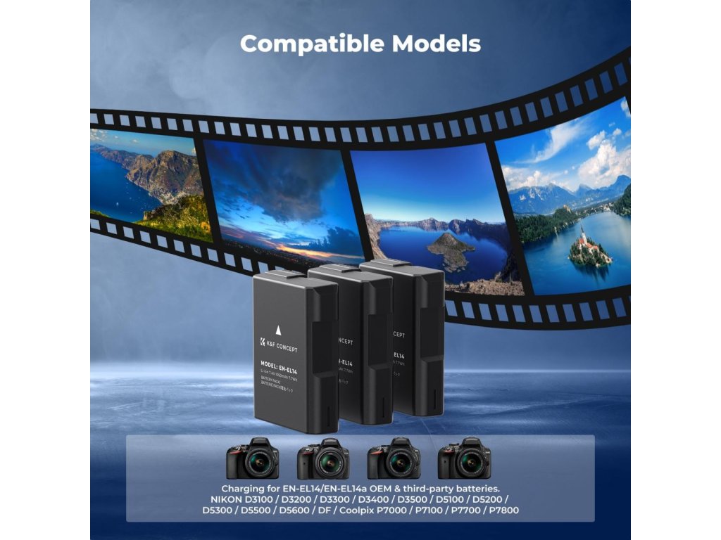 PaginăAcumulator K&F Concept Nikon EN-EL14 prevede 3 baterii EN-EL14/EN-EL14a de mare capacitate, cu o capacitate de 1050 mAh, 7,4 V, care oferă performanțe de lungă durată pentru fotografierea continuă cu aparatele foto Nikon. Compatibil cu modele precumD5600, D5500, D5300, D5200, D5100, D3500, D3400, D3300, D3200, D3100, Coolpix P7000/P7100/P7200/P7700/P7800și alte dispozitive alimentate de bateria EN-EL14.