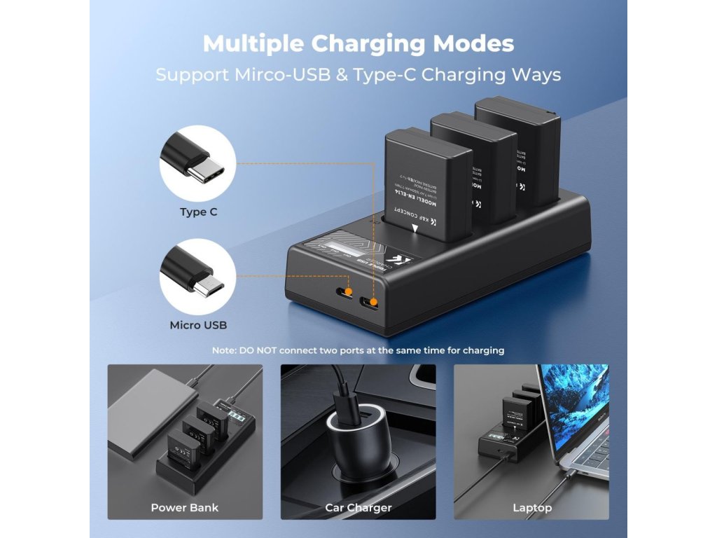Conceptul K&FPachet de 3 baterii pentru aparat foto Nikon EN-EL14 cu încărcător și afișaj LCD cu 3 sloturiIncludeBaterii EN-EL14 cu o capacitate de 1050 mAh aÎncărcător cu afișaj LCDcu intrare dublă Micro USB/Type-C pentru încărcare rapidă și sigură.