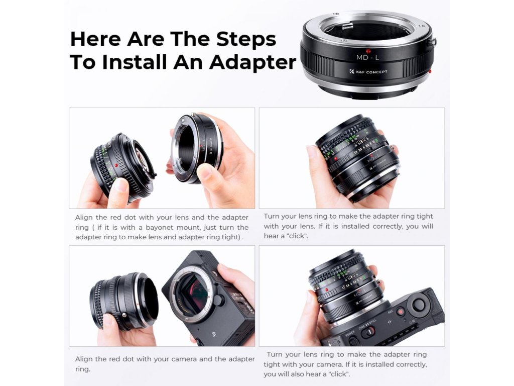 PaginăConceptul K&FMD-LFocalizare manualăAdaptoreste compatibil cuMinolta Rokkor(SR/MD/MC)lentilepentru camere cuSuport în formă de L.