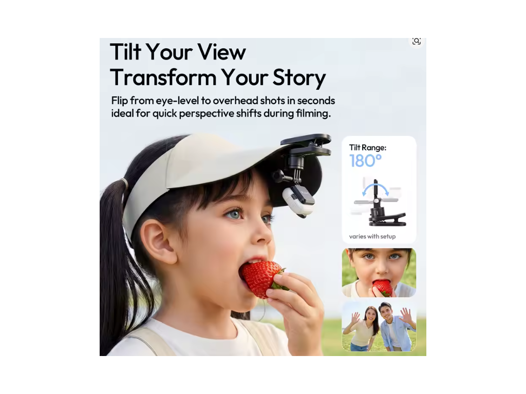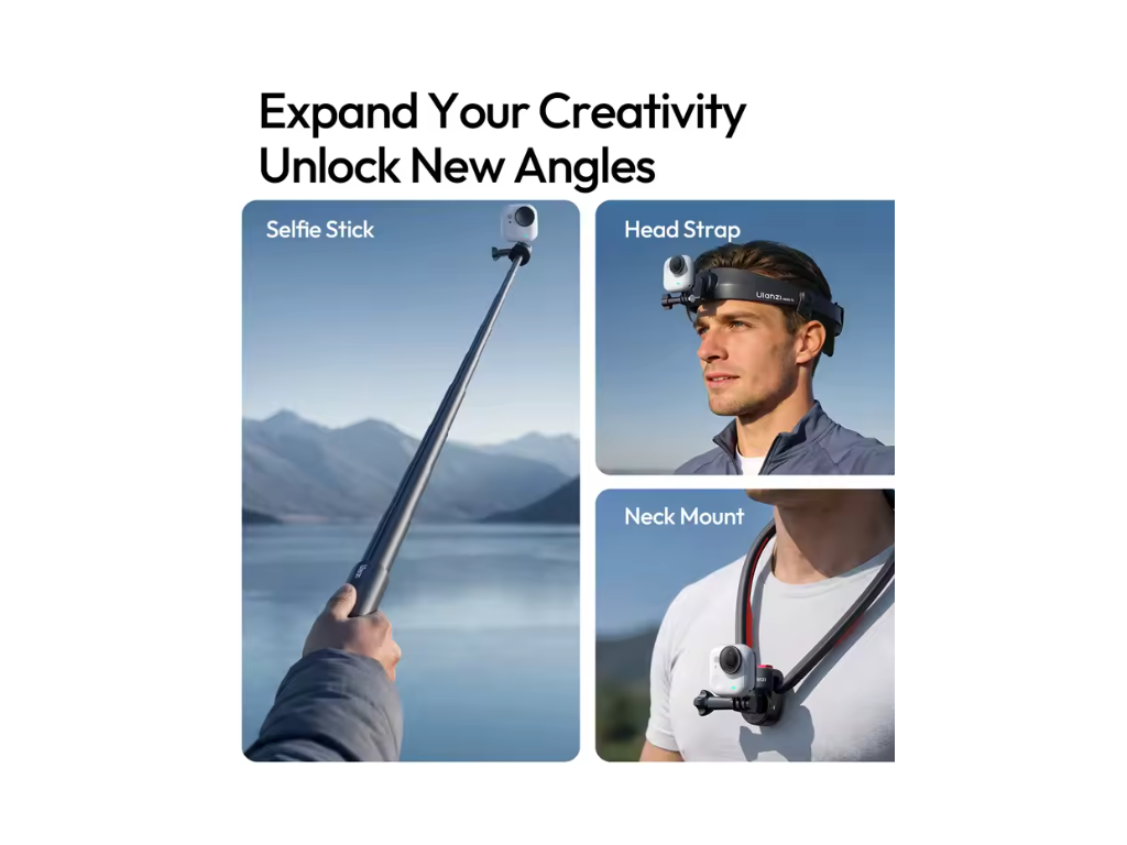- Compatibil cu curele pentru cap, suporturi pentru gât și bețe pentru selfie-uri