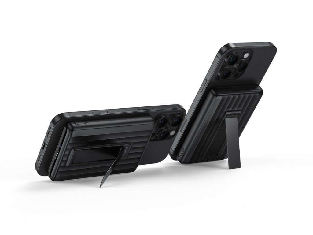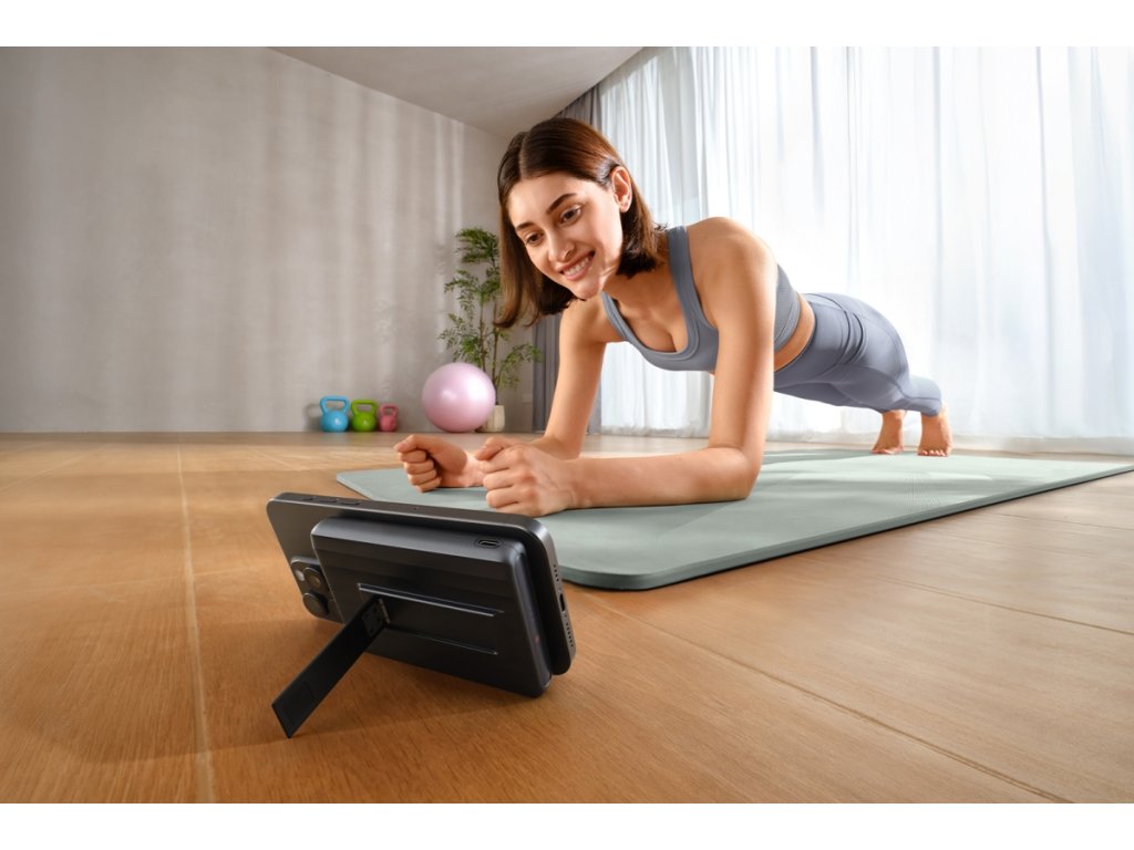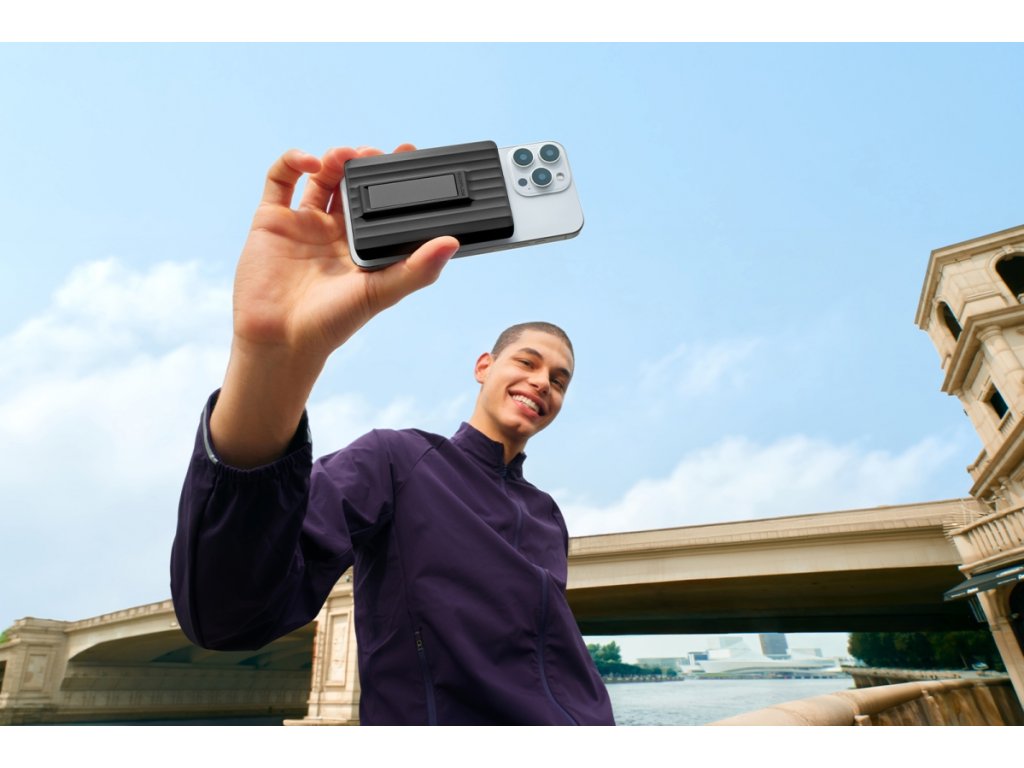 Un suport magnetic puternic pentru telefonul mobil, cu magneți N52, și un suport pliabil încorporat vă permit să utilizați EcoFlow RAPID Mag Power Bank 10K ca suport care asigură vizionarea confortabilă a videoclipurilor sau citirea mesajelor pe ecranul telefonului.