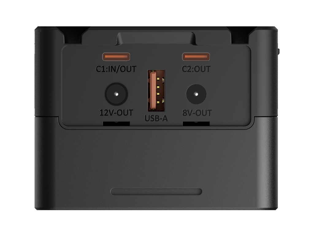 De asemenea, include interfețe precum electrodul D-tap/USB-C/USB-A/DC 8V/DC 12V/BP pentru încărcarea/alimentarea eficientă a camerei/camerului video/monitorului/transmițătorului video fără fir/luminii video LED/telefonului mobil/laptop-ului etc. fără a folosi o placă de conversie cu montură în V!