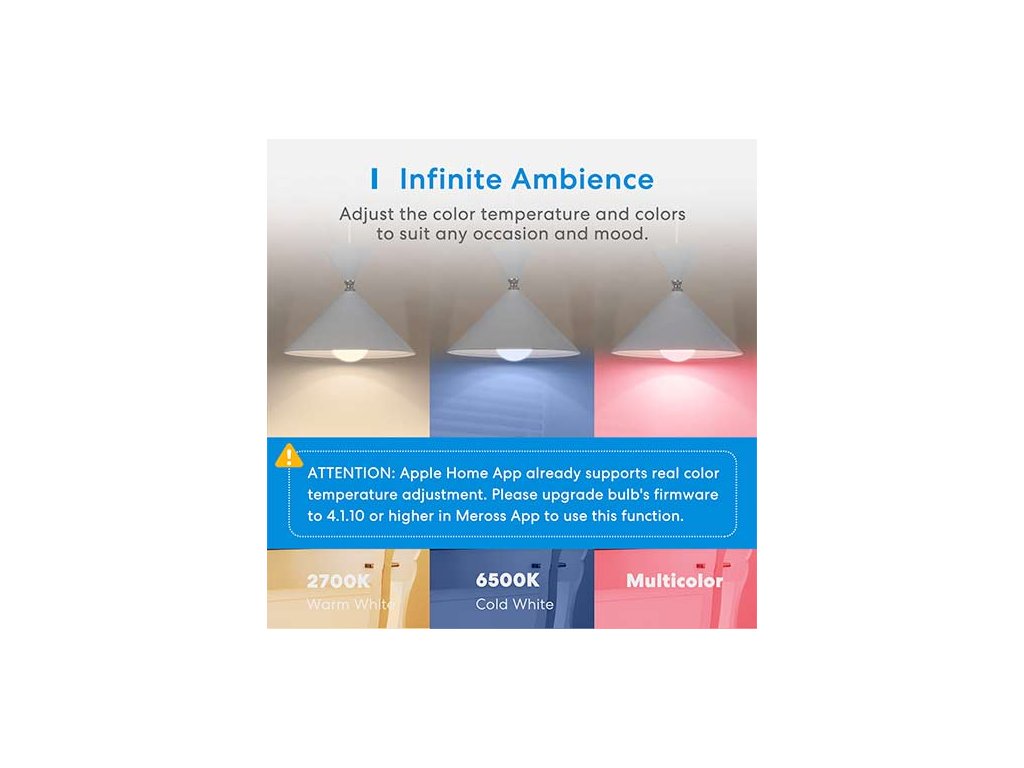 - bec inteligent cu optiunea de reglare a luminozitatii, reglare a aspectului luminii si setare din mai multe culori RGB - alb cald (2700K), alb rece (6500K) și nuanțe de culoare pentru a crea atmosfera potrivită pentru odihnă și muncă - controlați becul oricând și de oriunde folosind aplicația Meross - posibilitate de control vocal al dispozitivelor - orar reglabil pentru pornirea/oprirea automată a iluminatului (de exemplu, în vacanță) - comunicare wireless prin Wi-Fi - manșon din plastic rezistent la foc - protectie la supratensiune a sistemului intern - economisind până la 78% din energie comparativ cu un bec cu luminozitate similară - realizat din policarbonat rezistent - compatibil cu Apple HomeKit (Siri), Amazon Alexa, Google Assistant și IFTTTParametri suplimentari