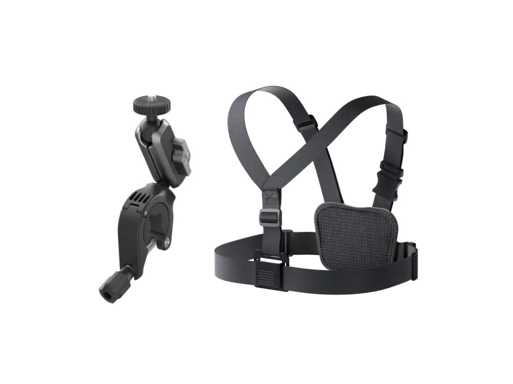 Pachet de accesorii pentru camerele de acțiune ONE X2, X3, ONE R, ONE RS, GO2 și GO3. Camera trebuie atașată direct la șurubul trepiedului suportului ghidonului - din motive de stabilitate, nu este posibilă introducerea unei tije de prelungire între cameră și suport.