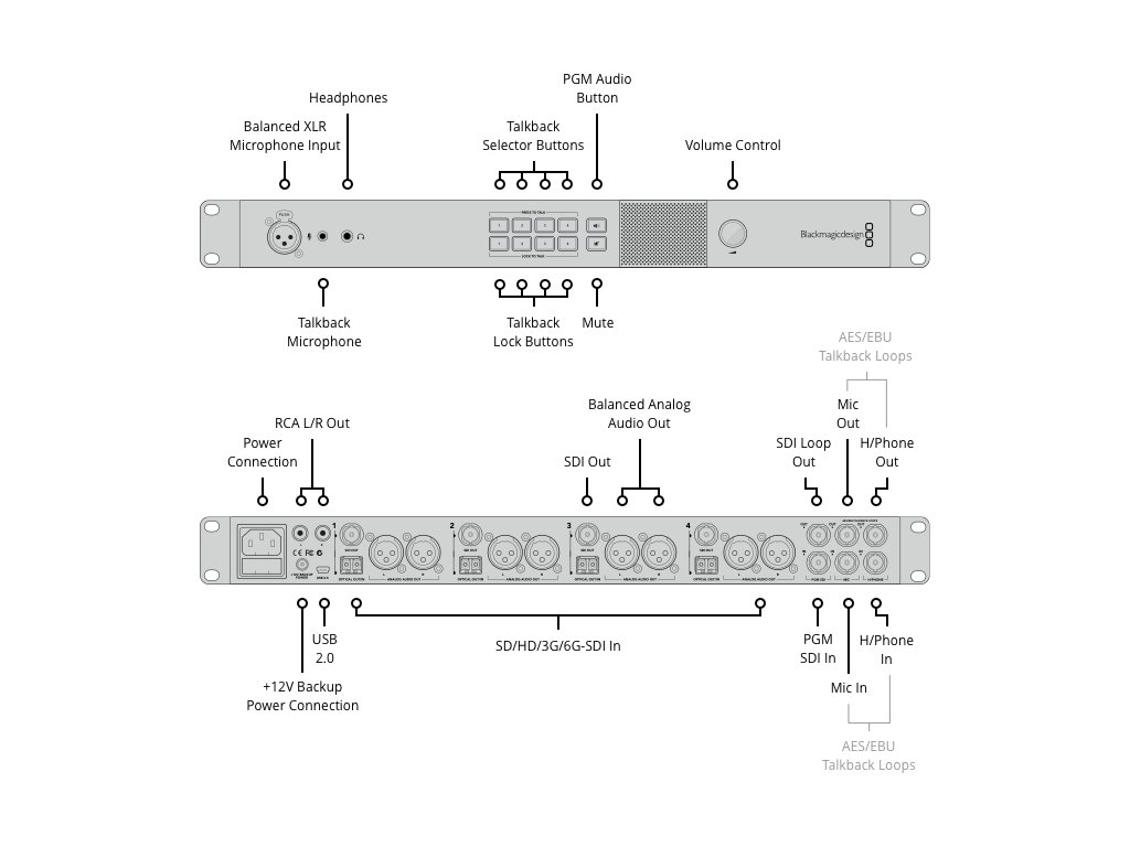 ATEM Studio Converter 2 oferă, de asemenea, butoane pentru controlul funcțiilor de comunicare - comunicarea cu camerele poate fi dezactivată complet sau activată selectiv atunci când regizorul dorește să comunice cu un anumit cameraman. În plus, căștile robuste pot fi folosite pentru aplicații de aviație, care sunt adesea mai ieftine și, de asemenea, mai robuste în comparație cu produsele pentru piața televiziunii. Căștile cu antenă asigură o atenuare excelentă a zgomotului ambiental și sunt disponibile de la mulți producători. Datorită robusteții lor, sunt perfect potrivite pentru utilizarea în aplicații TV!