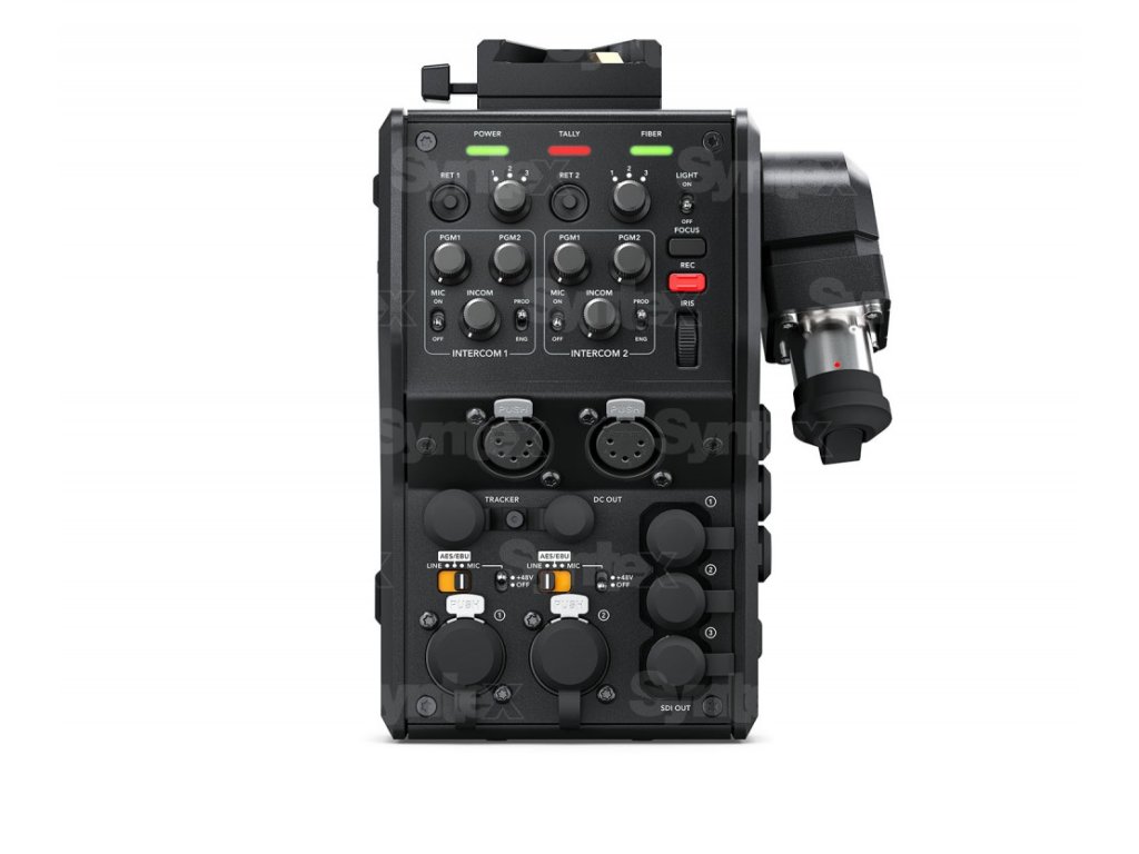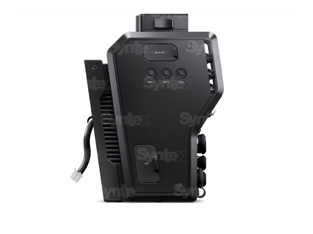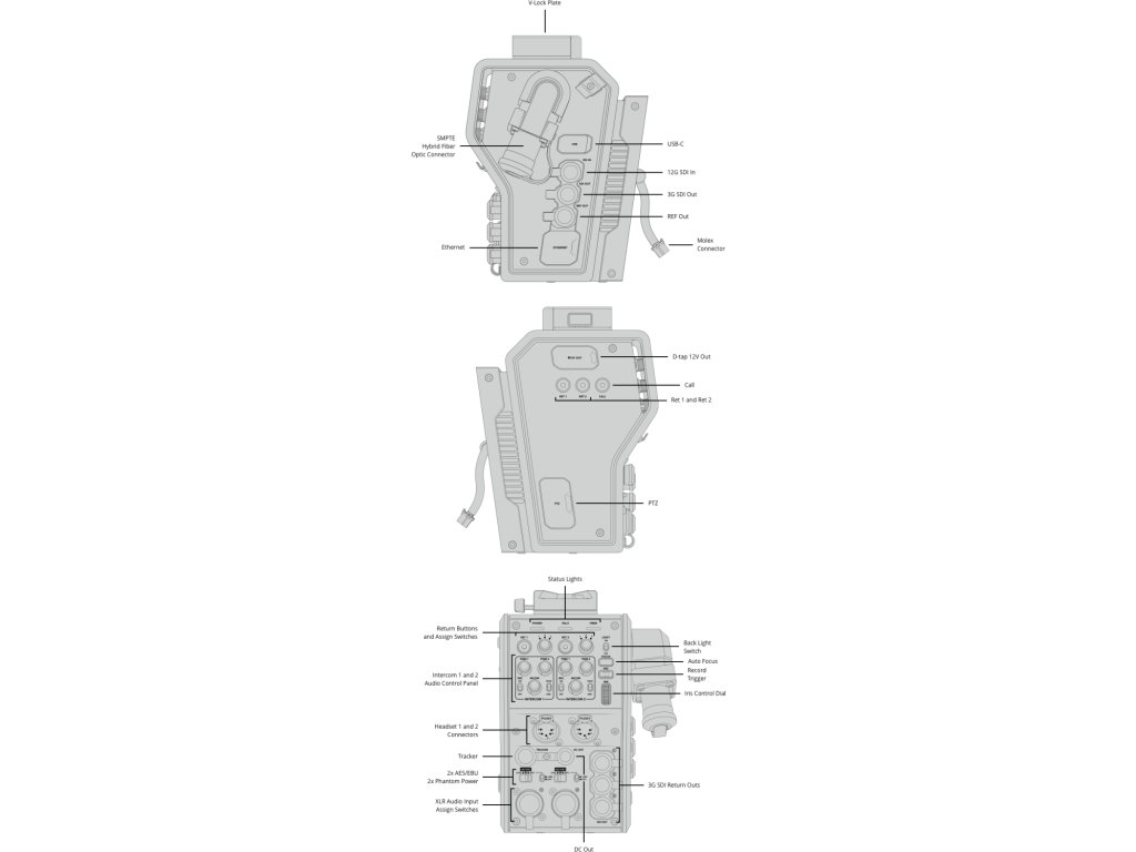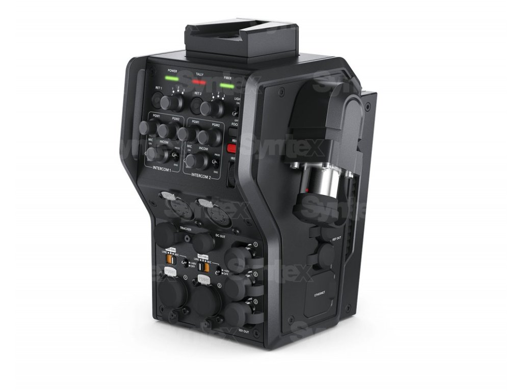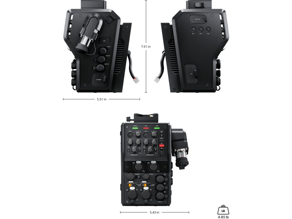 Convertorul camerei oferă apoi alimentare normală de 12 V pentru cameră și accesoriile sale. Se conectează la panoul din spate al camerelor URSA Mini și URSA Broadcast și convertește interfețele video și audio, comenzile de la distanță, liniile de comunicație și semnal și puterea la cablarea hibridă SMPTE standard. Și deoarece camerele de studio sunt controlate aproape exclusiv din poziția camerei din spate, convertorul oferă și funcții standard ale camerei de studio. Previzualizarea liniilor din tavan, interfonul (două seturi independente), începerea înregistrării, deschiderea și focalizarea pot fi controlate. Există, de asemenea, o interfață V-Lock în partea de sus a convertorului pentru alte accesorii, cum ar fi monitorul profesional Blackmagic Studio Viewfinder