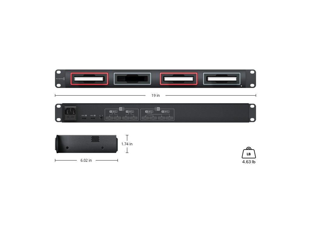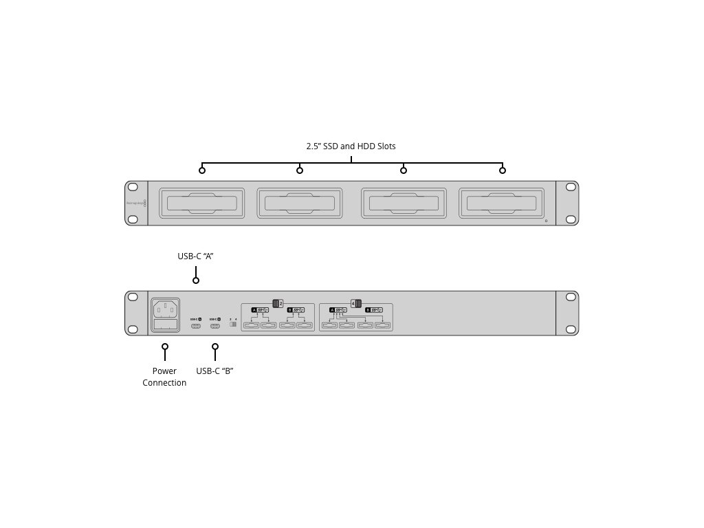 Spre deosebire de cablurile de andocare SSD ieftine, Blackmagic MultiDock 10G este un design compact din metal de 1 RU pe care clienții îl pot monta în orice rack profesional. Fiecare slot de unitate are un indicator de unitate iluminat, astfel încât clienții să poată vedea când sunt accesate unitățile. Panoul din spate include 2 conexiuni USB-C și un comutator glisant care vă permite să alegeți între utilizarea a 4 sloturi de unitate pentru fiecare conexiune USB-C sau 2 sloturi pe fiecare conector USB-C pentru utilizare partajată.