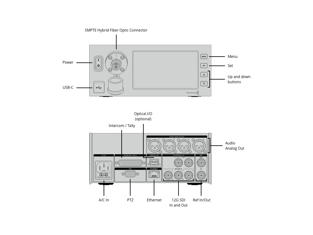 Blackmagic Camera Fiber Converter are un corp metalic foarte robust, iar designul se potrivește perfect cu camera URSA Broadcast. Desigur, există garnituri de praf pe conectori sau interfața V-Lock de top pentru conectarea monitorului Blackmagic Studio Viewfinder. Convertorul Blackmagic Studio Fibre este proiectat pentru a fi montat într-un rack cu lățime standard (folosind un adaptor opțional) și include un conector pentru cameră pe panoul frontal și un afișaj LCD de 5 inchi pentru previzualizarea instantanee a semnalului.