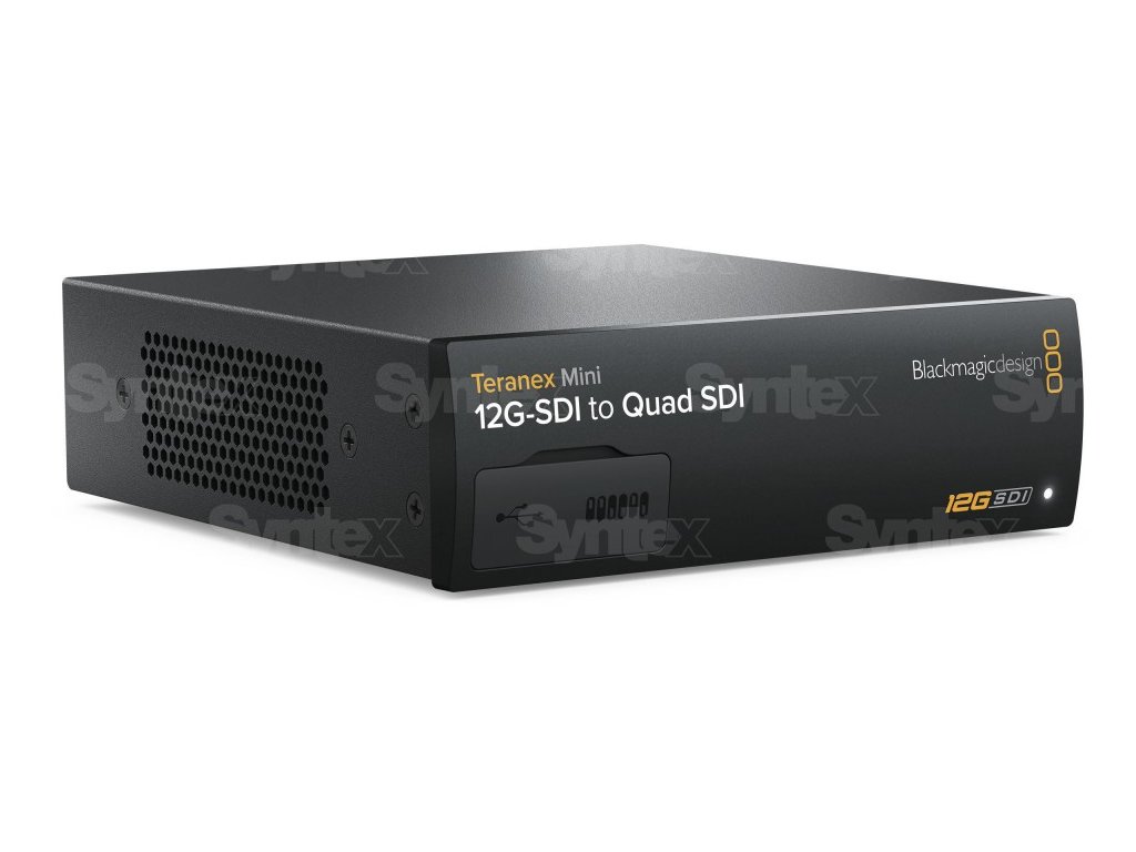 Teranex Mini 12G-SDI în Quad SDI convertește 12G-SDI în Quad Link SDI, astfel încât clienții să poată conecta cele mai recente echipamente 12G-SDI Ultra HD cu echipamente Quad Link Ultra HD. Acest model permite, de asemenea, să fie împărțit Ultra HD SDI în patru ieșiri HD SDI pentru a fi utilizat cu afișaje HD obișnuite pentru a crea afișaje în stil video wall.