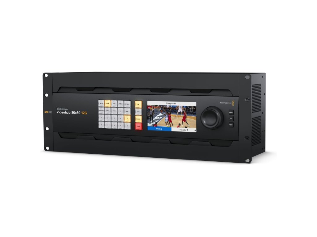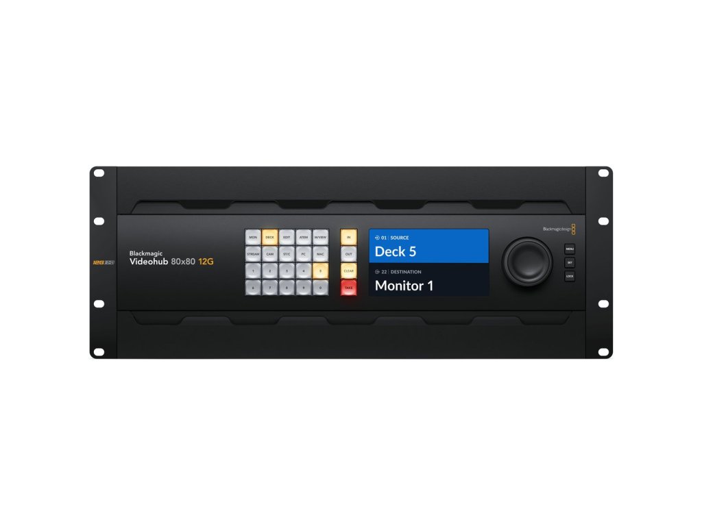 Blackmagic Videohub 80x80 12G, un router 80x80 12G-SDI mai mare care permite clienților să se conecteze și să direcționeze orice combinație de SD, HD și Ultra HD pe același router simultan. Blackmagic Videohub 80x80 12G are un panou frontal cu butoane de comenzi rapide, un afișaj LCD care poate afișa etichete sau videoclipuri live, un buton rotativ din metal prelucrat pentru a căuta surse video, conexiuni de referință și putere redundantă.Disponibil din 11/2023.