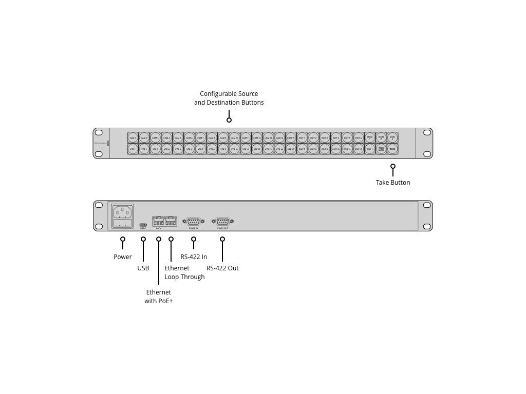 De exemplu, dacă sub monitor este instalat un Videohub Smart Control Pro, ieșirea routerului conectată la acel monitor poate fi setată la o sursă diferită de router de fiecare dată când este apăsat butonul. Videohub Smart Control Pro include conectivitate USB și software ușor de utilizat pentru Mac și Windows pentru a configura fiecare buton. Butoanele sunt iluminate din spate în alb strălucitor.