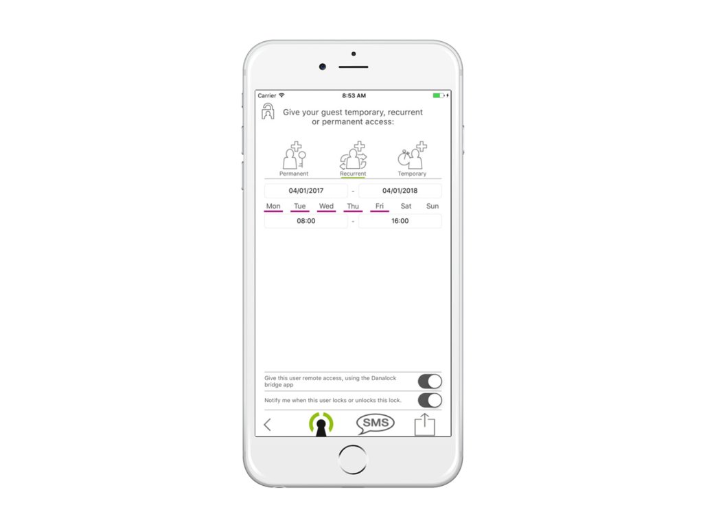 În mod neașteptat, trebuie să lași meșteri să intre în apartament atunci când trebuie să fii în altă parte. O doamnă de la curățenie vine la tine acasă în fiecare miercuri, dar nu vrei să-i dai cheile. Cu Danalock, aceste situații nu vor mai fi o problemă. În calitate de administrator, puteți acorda oricui acces unic, recurent sau permanent. Permisiunea poate fi trimisă prin e-mail sau SMS. Utilizatorul descarcă o aplicație care deblochează blocarea, dar numai la ore definite. Puteți modifica oricând drepturile utilizatorului sau le puteți modifica oricând pentru utilizator. Dacă doriți, veți fi anunțat că utilizatorii v-au acceptat invitația și, de asemenea, de fiecare dată când unul dintre ei folosește blocarea. O prezentare completă a cine v-a deblocat și când este disponibilă în aplicație.