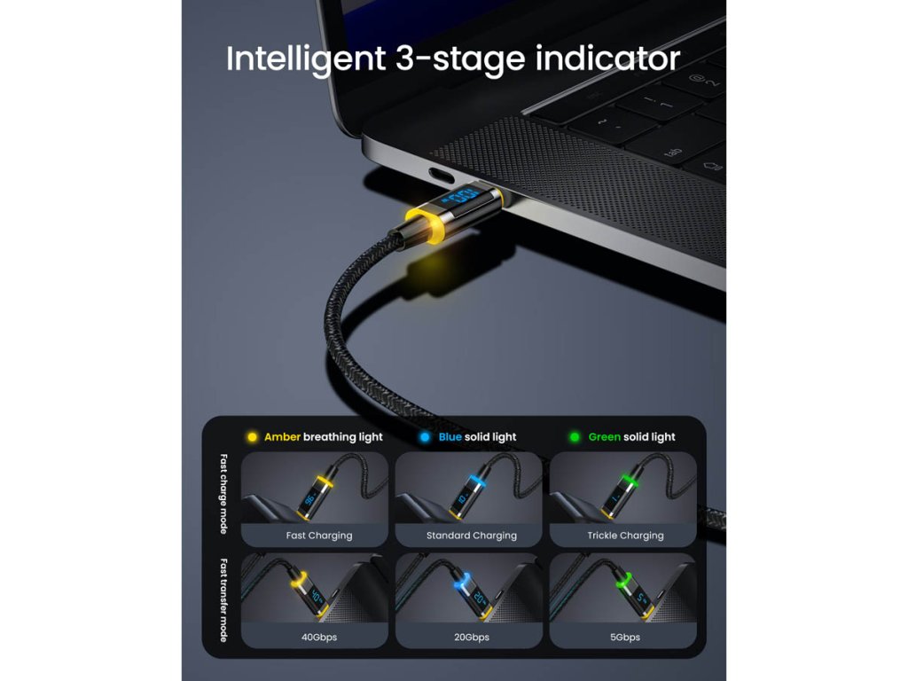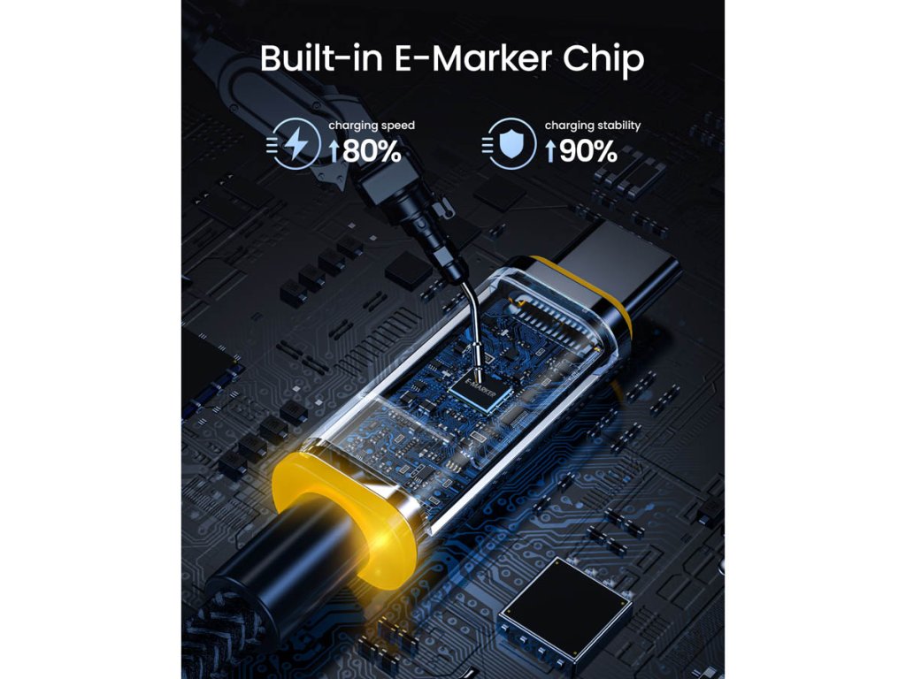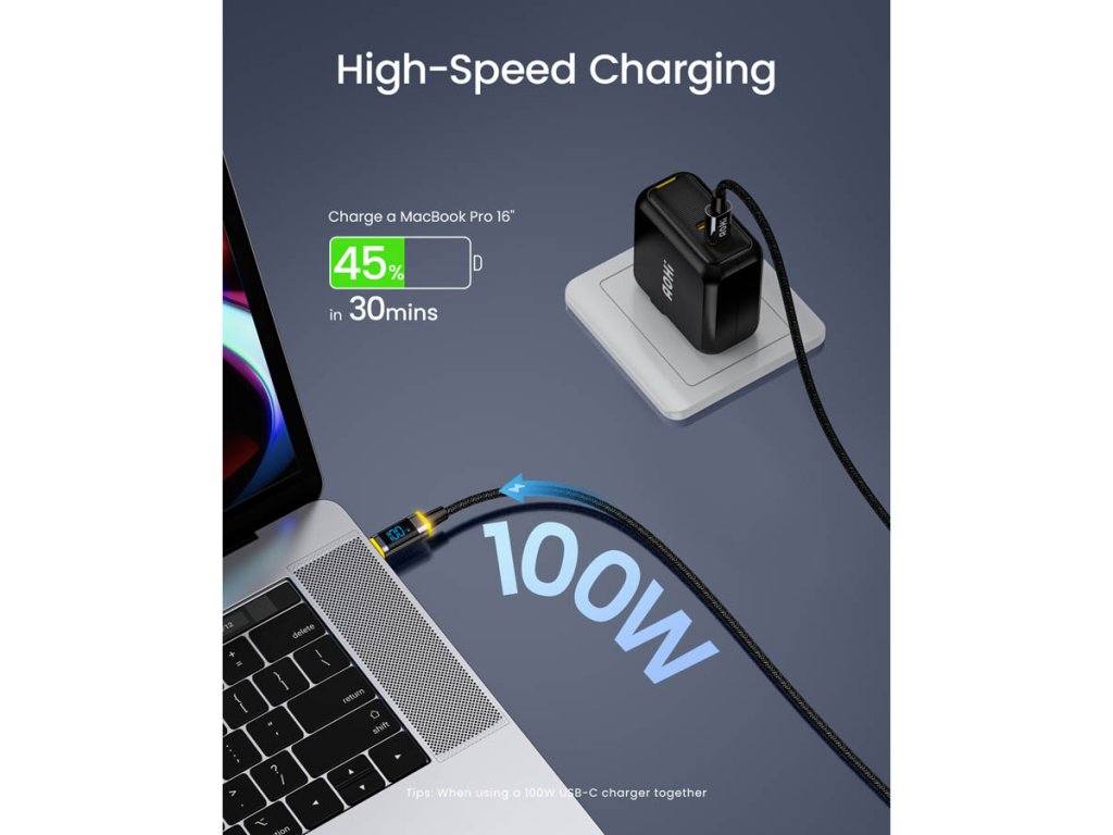 Îți poți încărca bateria telefonului, laptopului sau tabletei fără așteptarea enervantă! AOHi ți-a pregătit un cablu de încărcare Magline PRO+ excelent, care se va ocupa de toate nevoile tale.un dispozitiv cu interfață USB-C.Își ia puterea de până la 100 W (5 A)Asta înseamnă că poți încărca, de exemplu, un MacBook Pro de 16'' de la 0% la 45% în doar 30 de minute! Oare o astfel de cantitate de curent de intrare este pe punctul de a deteriora electronicele și accesoriile mici? Nu-ți face griji, și acest lucru este sub control.Cipul E-marker integrat supraveghează siguranța dispozitivelor dumneavoastră. Acest curent tranzitoriu reglează și protejează astfel dispozitivul dumneavoastră de pericolul scurtcircuitelor, supraîncălzirii, tensiunii și curentului excesiv de înalte sau fluctuațiilor acestuia.Datorită cipului de încărcare, chiar și la o astfel de viteză rămâne sigură și netedă.Mențineți procesul de încărcare sub control complet