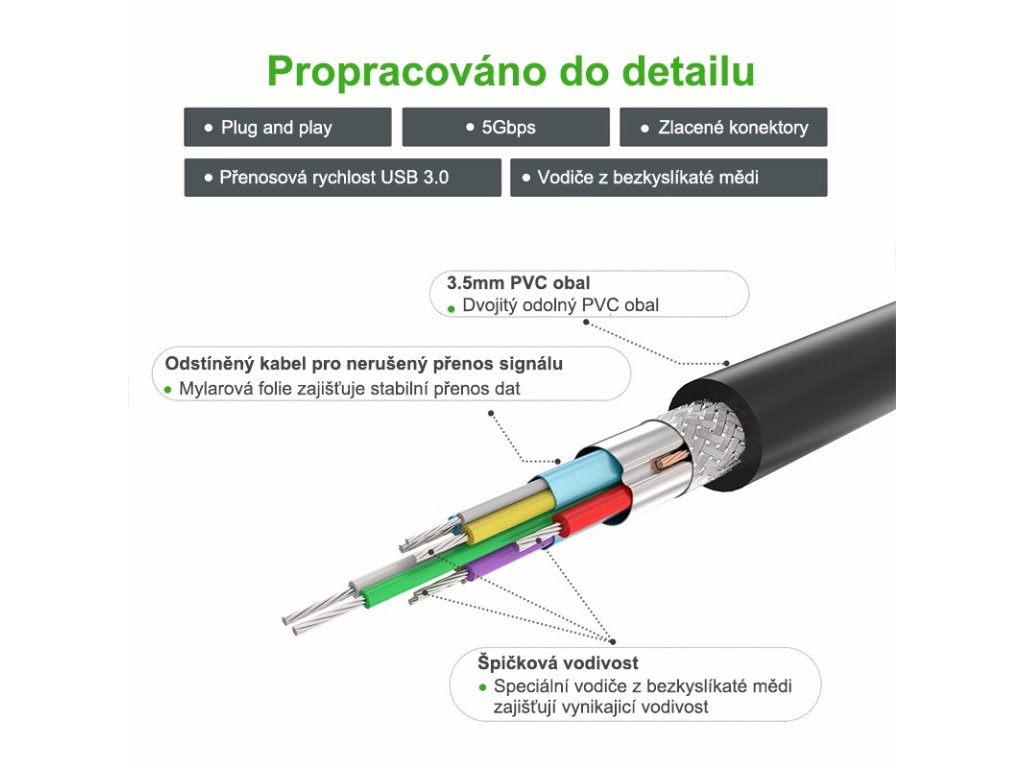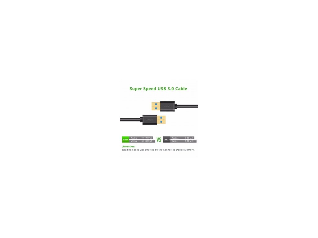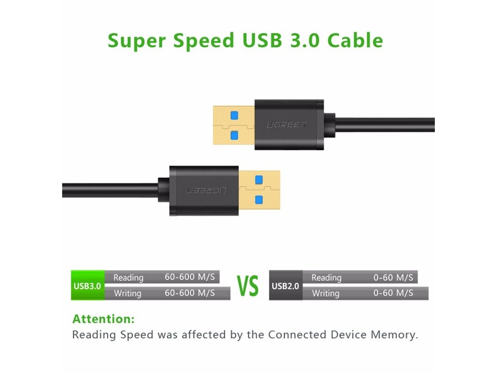 Cablu de conectare de date si alimentare USB 3.0 rezistent si in acelasi timp flexibil Ugreen cu conectori placati cu aur cu corp din PVC intarit. Cablul acceptă transfer de date USB SuperSpeed 5 Gbps și încărcare curentă de 2,4 A.