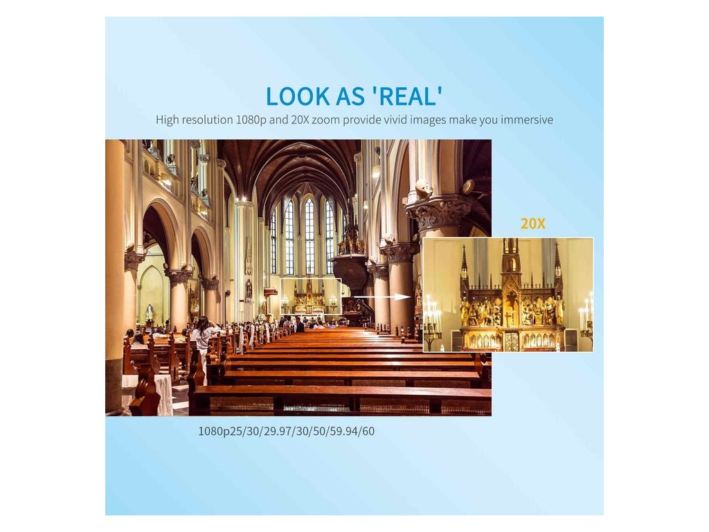 Înaltă definiție 1080P @ 60fps, reproducere excelentă a culorilor, zoom 20x oferă o optică superioară și un videoclip realist pentru a crea experiența de a sta împreună în aceeași cameră, chiar dacă vă aflați la o mie de mile distanță.