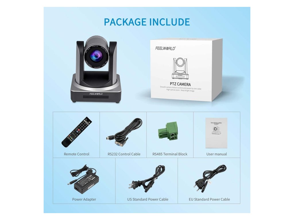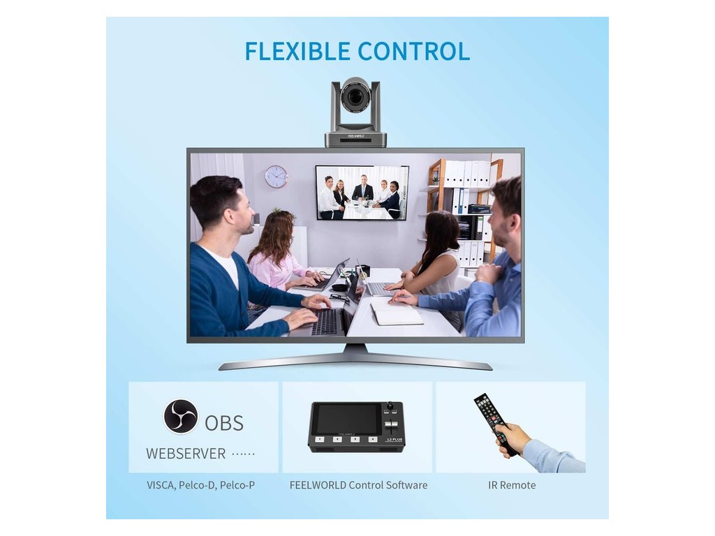 Utilizați telecomanda portabilă pentru a deplasa, înclina și mări pentru a vedea totul în spațiul dvs. de lucru. De asemenea, îl puteți controla dintr-o locație de la distanță folosind software-ul WBESREVER sau comutatorul video FEELWORLD L2 PLUS.