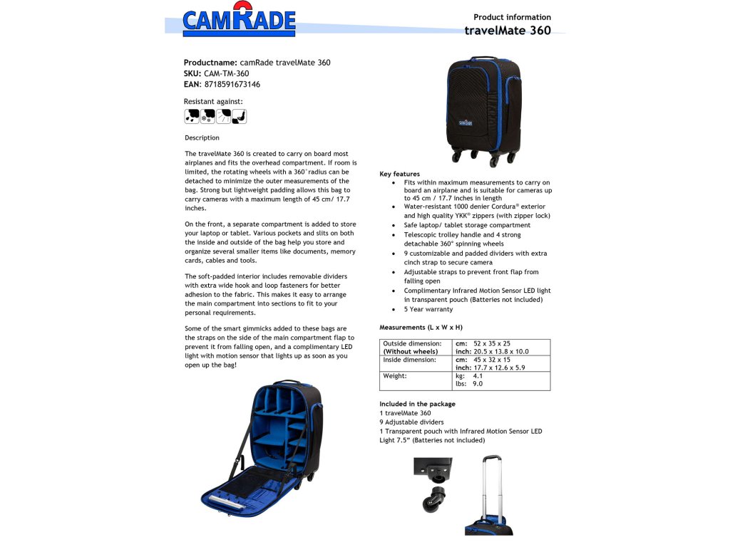 TravelMate 360 este conceput pentru a fi transportat la bordul majorității aeronavelor și se potrivește în compartimentul de deasupra capului. Dacă spațiul este limitat, roțile pivotante la 360° pot fi detașate pentru a minimiza dimensiunile exterioare ale genții. Căptușeala puternică, dar ușoară, permite acestei geanți să transporte camere cu o lungime de până la 45 cm / 17,7 inchi. În față este adăugat un compartiment separat pentru depozitarea unui laptop sau tabletă. Diverse buzunare și fante din interiorul și exteriorul genții vă ajută să depozitați și să organizați mai multe obiecte mai mici, cum ar fi documente, carduri de memorie, cabluri și unelte.