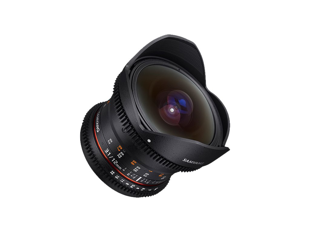 Samyang 12mm T3.1 VDSLR ED AS NCS Fish-Eye este un obiectiv video manual de tip „ochi de pește” destinat camerelor cu senzor full frame, care permite o lucrare mai fină cu video datorită valorilor „T” ale diafragmei.Pentru sistemul de focalizare de urmărire este instalat un inel de focalizare dintat. Puteți schimba diafragma ușor și liniștit folosind inelele de focalizare netede. Pentru o mai mare comoditate, scalele de distanță și valorile „T” sunt marcate pe ambele părți ale lentilei.