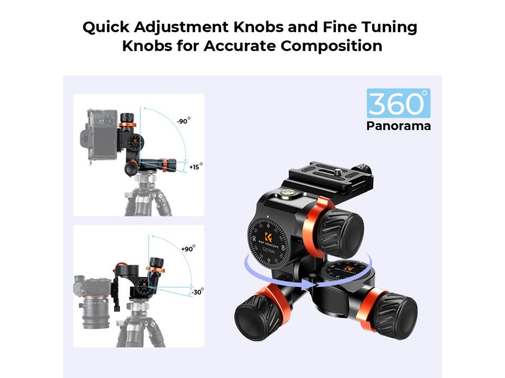 Cap de trepied cu angrenaj cu 3 căi K&F Concept cu proces de aliaj de aluminiu CNC, înaltă...
