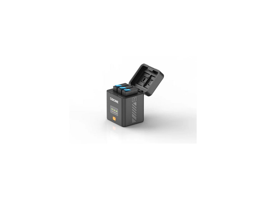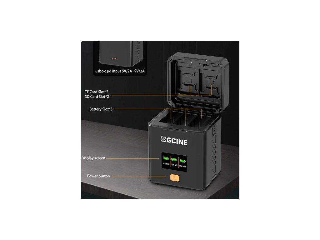 Carcasa de încărcare ZGCINE pentru GoPro 13 este un accesoriu multifuncțional conceput pentru a încărca simultan până la trei baterii GoPro 13. Dispune de un sistem integrat de carduri de memorie cu sloturi pentru două carduri SD și două carduri TF, precum și de un ecran OLED de 0,96 inci pentru monitorizarea stării de încărcare, ceea ce îl face o soluție portabilă all-in-one pentru alimentare și stocare media.