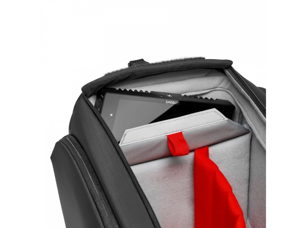 Această geantă nu numai că ajută la reducerea șocurilor și vibrațiilor, dar și interiorul său este perfect adaptabil la echipament. Ca parte a sistemului inovator de protecție a camerei cu interior căptușit, îți vei păstra echipamentul în siguranță și bine depozitat. Zona lentilelor este protejată de o pernă. Există, de asemenea, un buzunar extensibil pentru articole mai mari pe toată lungimea genții, precum și un buzunar pentru alte lucruri esențiale.