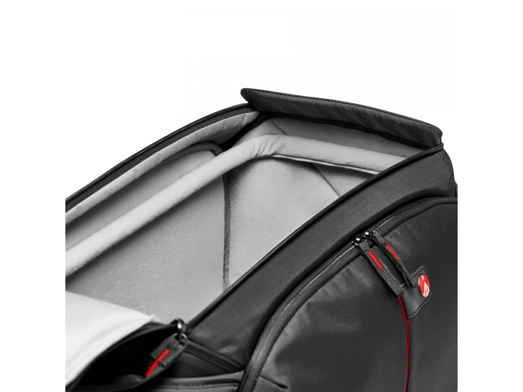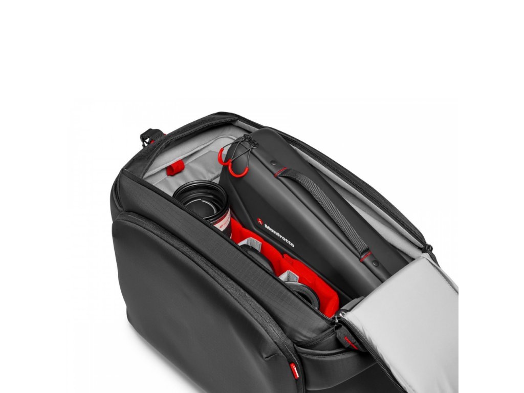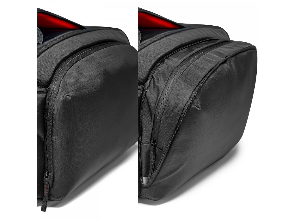 Intrarea principală este dotată cu fermoar dublu. Interiorul contine partitii Manfrotto Flexi. Această geantă nu numai că ajută la reducerea șocurilor și vibrațiilor, dar și interiorul său este perfect adaptabil la echipament. Ca parte a sistemului inovator de protecție a camerei cu interior căptușit, îți vei păstra echipamentul în siguranță și bine depozitat. Zona lentilelor este protejată de o pernă. Există, de asemenea, un buzunar extensibil pentru articole mai mari pe toată lungimea genții, precum și un buzunar pentru alte lucruri esențiale.
