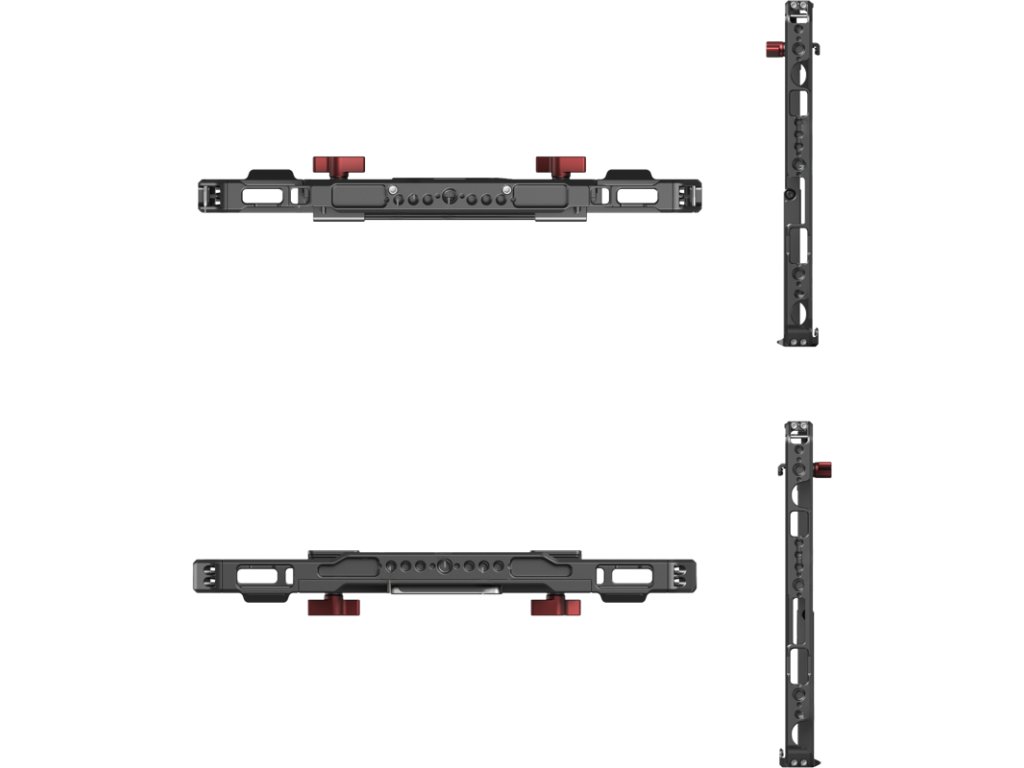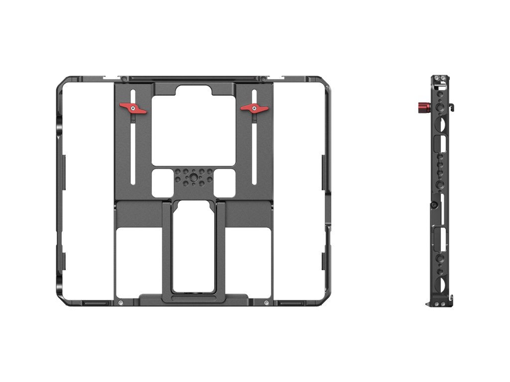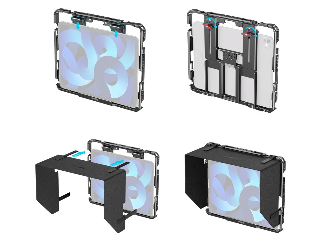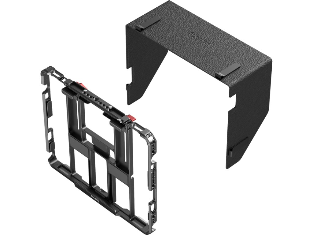 Cutia include o parasolară detașabilă cu velcro pentru a reduce strălucirea, un suport reglabil pentru utilizare stabilă pe birou și un slot magnetic pentru acces facil la Apple Pencil.Are un design glisant cu tampoane de cauciuc pentru a proteja iPad-ul și include găuri de 1/4"-20 și 3/8"-16, o gaură pentru curea, un suport pentru patina de fixare și o șină NATO pentru montarea de accesorii precum adaptoare NPF, baterii externe și suporturi SSD.