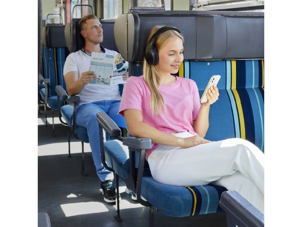 - căști fără fir discrete, dar puternice, cu bandă pentru cap (pe ureche) pentru a asculta muzică prin Bluetooth fără interferențe din împrejurimi - funcția de suprimare activă a zgomotului ambiental (ANC) suprimă zgomotul ambiental și, astfel, permite ascultarea netulburată - ideal pentru reducerea zgomotului monoton (de exemplu, într-un avion, într-un tren) - constructia inchisa inconjoara urechile si asigura o buna izolare fonica fata de imprejurimi - carcasă căptușită confortabilă și arc reglabil al capului - structura rabatabila pentru transport usor - microfon integrat și buton de control, potrivit pentru un telefon mobil (poate fi folosit ca și cască) - suport pentru asistenții vocali Apple Siri și Google Assistant - Bluetooth Multipoint pentru posibilitatea de asociere cu mai multe dispozitive în același timp - conector jack pentru conexiune prin cablu - control al volumului la căști - baterie integrată cu o durată de până la 23 de ore de redare a muzicii (15 ore cu ANC activ) - geantă din material textil pentru a proteja căștile din mersParametri tehnici: