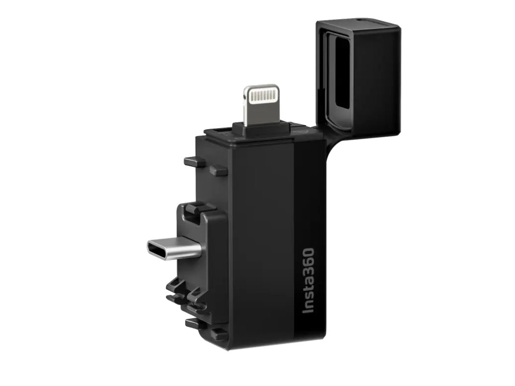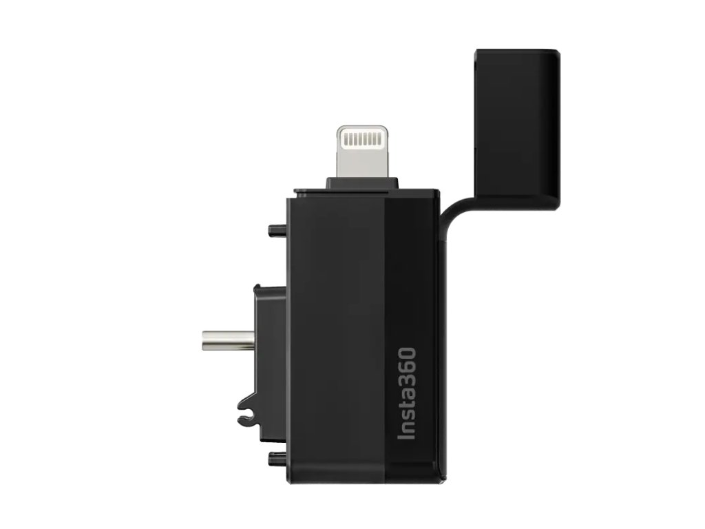 Cititor rapid de carduri pentru camera Insta360 X3. Cititorul servește la descărcarea rapidă a fișierelor de pe cardul camerei Insta360 X3 și apoi a trimite fișierele pe telefon. Conector Lightning și USB-C.