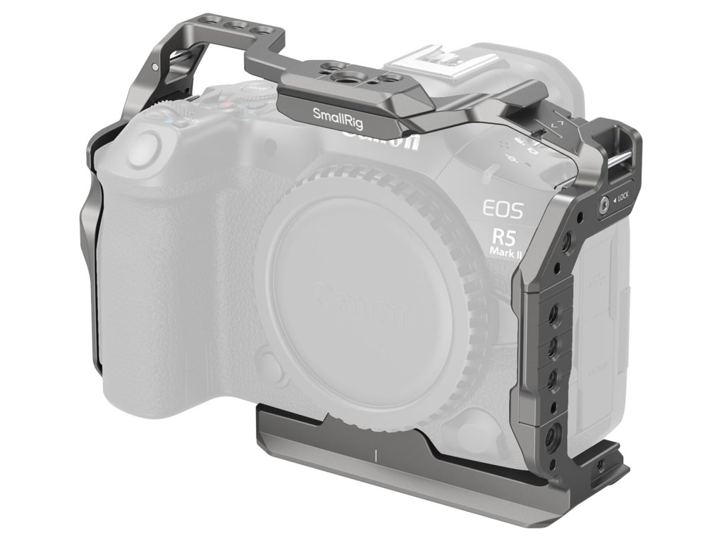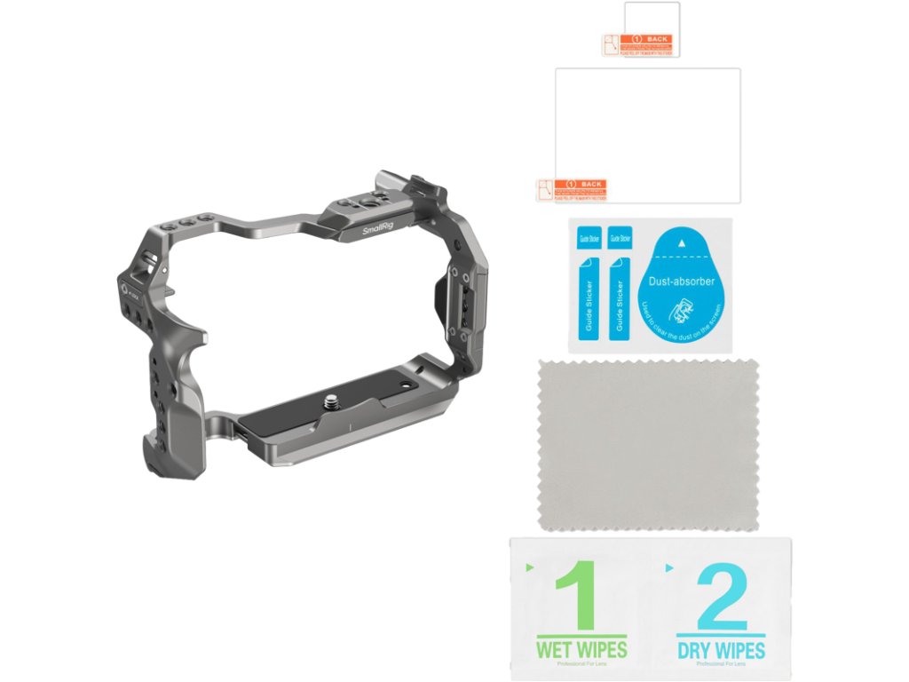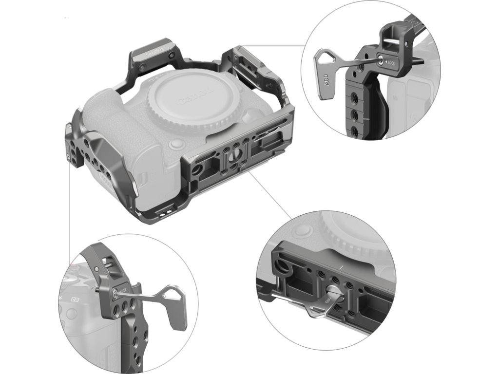 Carcasa fixează camera cu un singur șurub de 1/4"-20 în bază și două blocuri de poziționare pe laterale și include tampoane de silicon încorporate pentru a preveni zgârierea camerei.Carcasa oferă acces liber la toate butoanele, sloturile, ecranul, compartimentul bateriei și alte interfețe ale camerei.