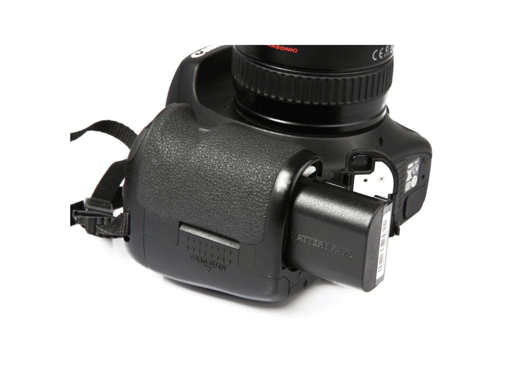 Un DSLR Canon poate citi informații despre S-8PE6, poate afișa nivelul de putere rămas pe ecranul de umăr și procentul exact de putere în sistemul de meniu.