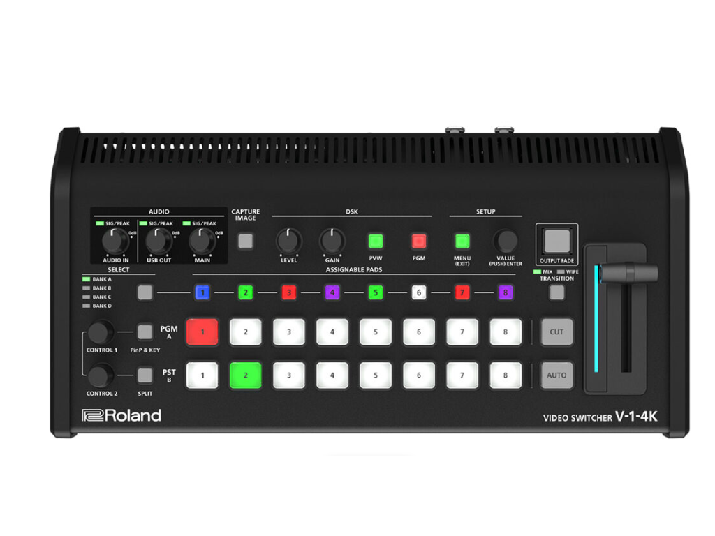 Comutatorul video Roland V-1-4K este o soluție compactă și versatilă pentru transmisiuni live și producții mici, suportând până la UHD 4K60 HDR. Cu 5 intrări HDMI, 5 ieșiri HDMI, streaming USB-C și comenzi tactile, permite comutarea, decuparea și reducerea scalării fără probleme pentru video de calitate profesională în medii corporative, educaționale sau de cult.