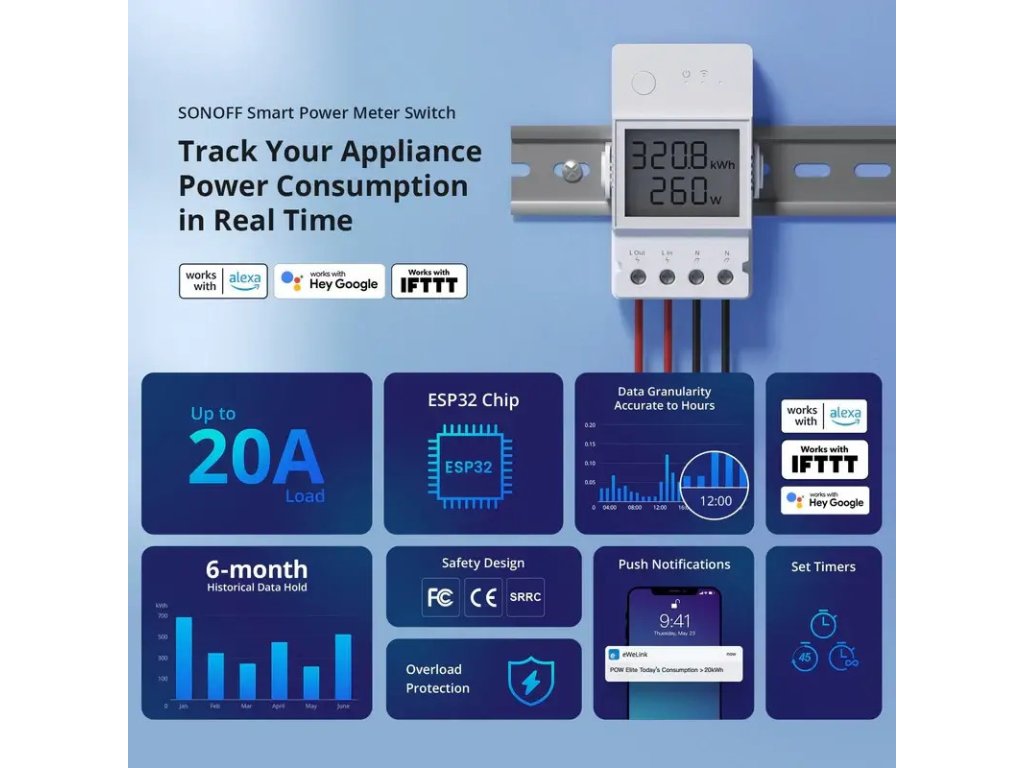 Comutator Wi-Fi SONOFF POWR320D POW Elite cu contor de energie