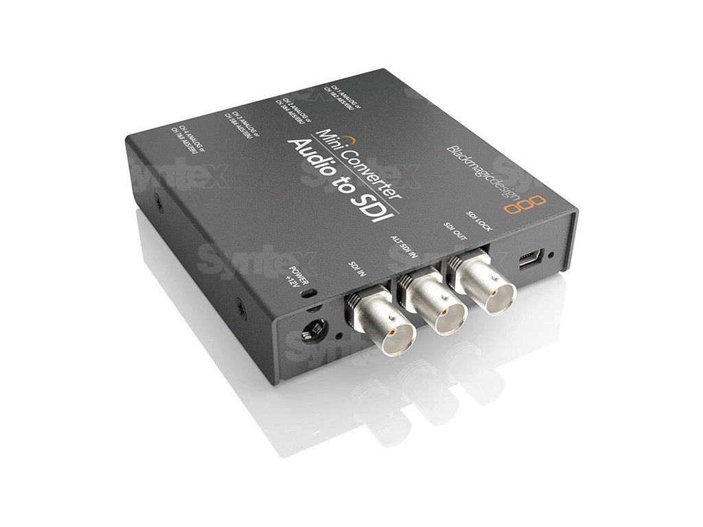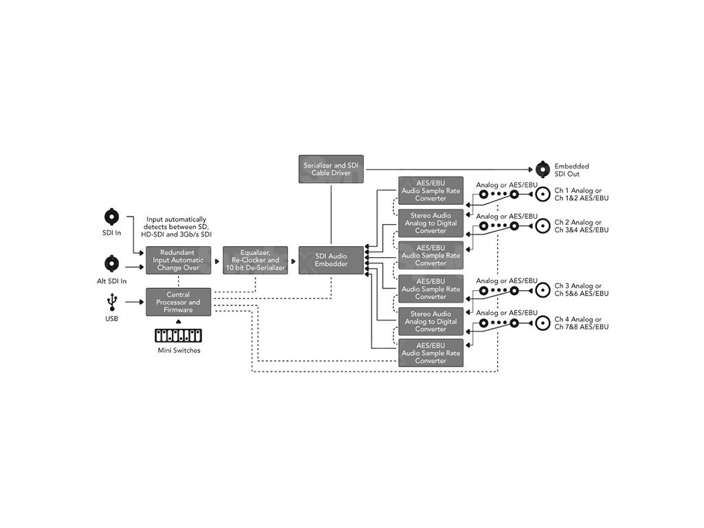 Conține tot ce aveți nevoie pentru a introduce 4 canale de audio analogic sau 8 canale de audio digital AES/EBU în orice conexiune video SDI. Introduceți sunetul de la dispozitive precum mixere audio și punți analogice în conexiunile video SDI pentru a fi utilizate cu routere și punți SDI sau pentru a adăuga canale audio suplimentare la convertoarele video!