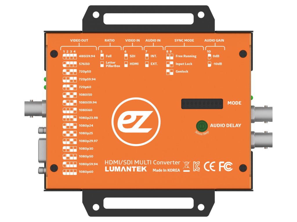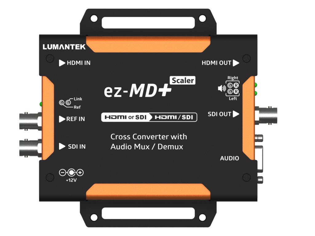 ez-MD+ de la LUMANTEK este un cross-converter compact pentru HDMI la SDI sau SDI la HDMI. Sistemul genlock permite sincronizarea semnalului pentru a combina semnale de ieșire nepereche. Acceptă sunet XLR echilibrat cu control al întârzierii audio.