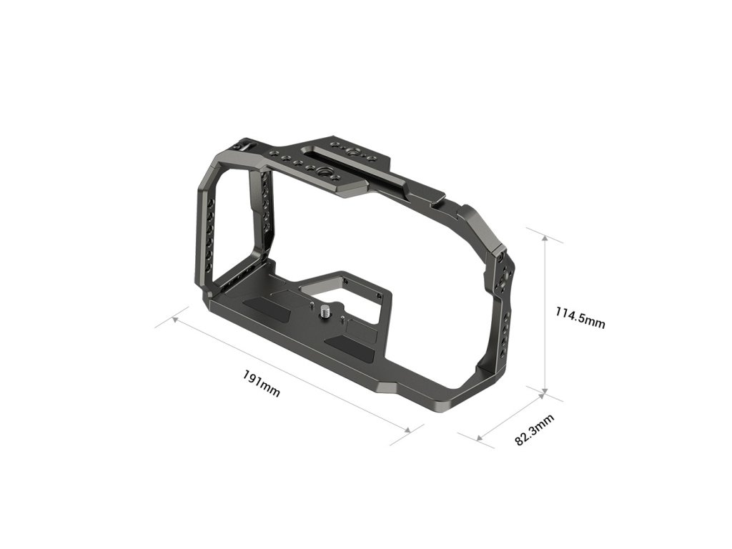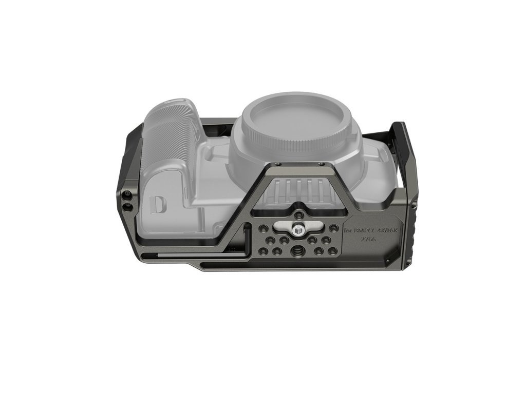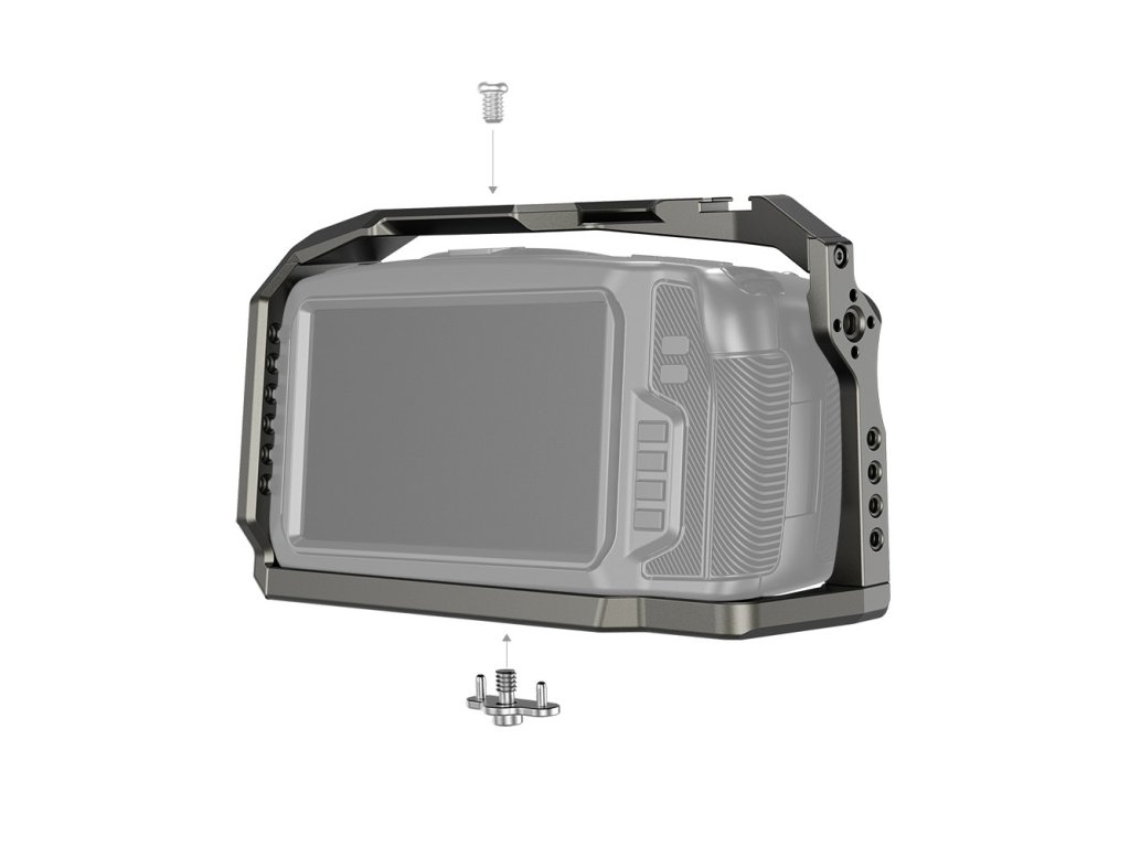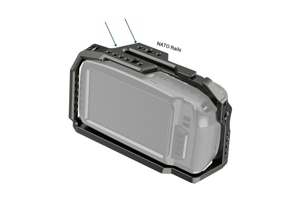 SmallRig Full Cage pentru BMPCC 4K și 6K (Dark Olive) 2766 oferă accesorii și protecție pentru cameră. Dispune de mai multe puncte de montare, inclusiv șine NATO, filete de montare 1/4"-20 și 3/8"-16, elemente de fixare în stil ARRI și montaj Cold Shoe. Cușca este atașată ferm de cameră cu șuruburi de 1/4”-20 în partea de sus și de jos.