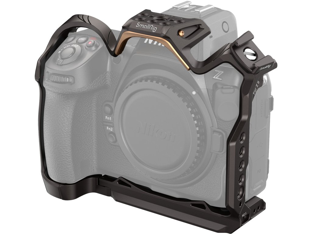 Cușca folosește un sistem de blocare în trei puncte: fixați-vă Nikon Z 8 folosind șurubul inferior de 1/4"-20 și două șuruburi M2.5 pe ambele părți. De asemenea, are plăcuțe încorporate pentru a preveni zgârierea camerei.Acces nerestricționat la butoane, sloturi pentru carduri, afișaj rabatabil și capacul bateriei.