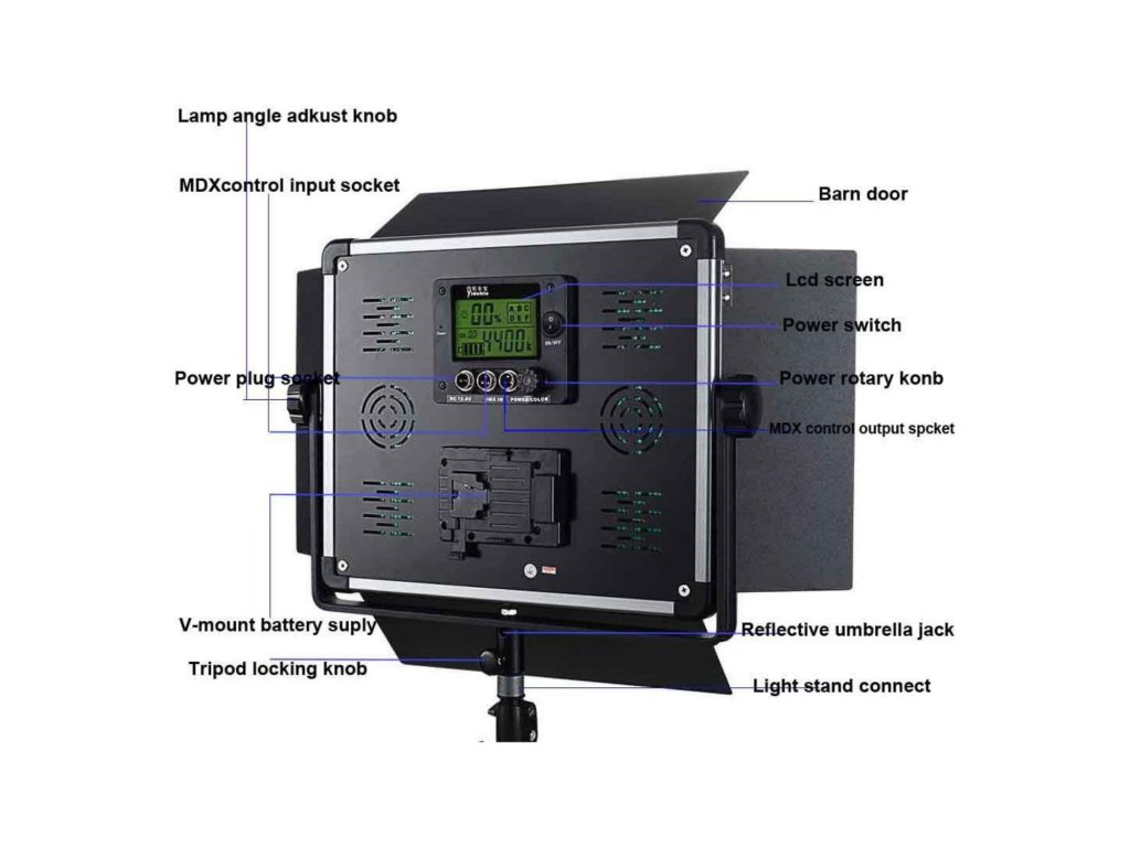 Afișaj digital, DMX 512, control manual. Material: aluminiu. Sursa de lumina LED, unghi de lumina 60 grade, CRI 97RA. Suport baterie: baterie SONY NP-F550, F750, F970. CURENT AC 100-250 V ȘI CURENTUL CONTINU 14,5 V