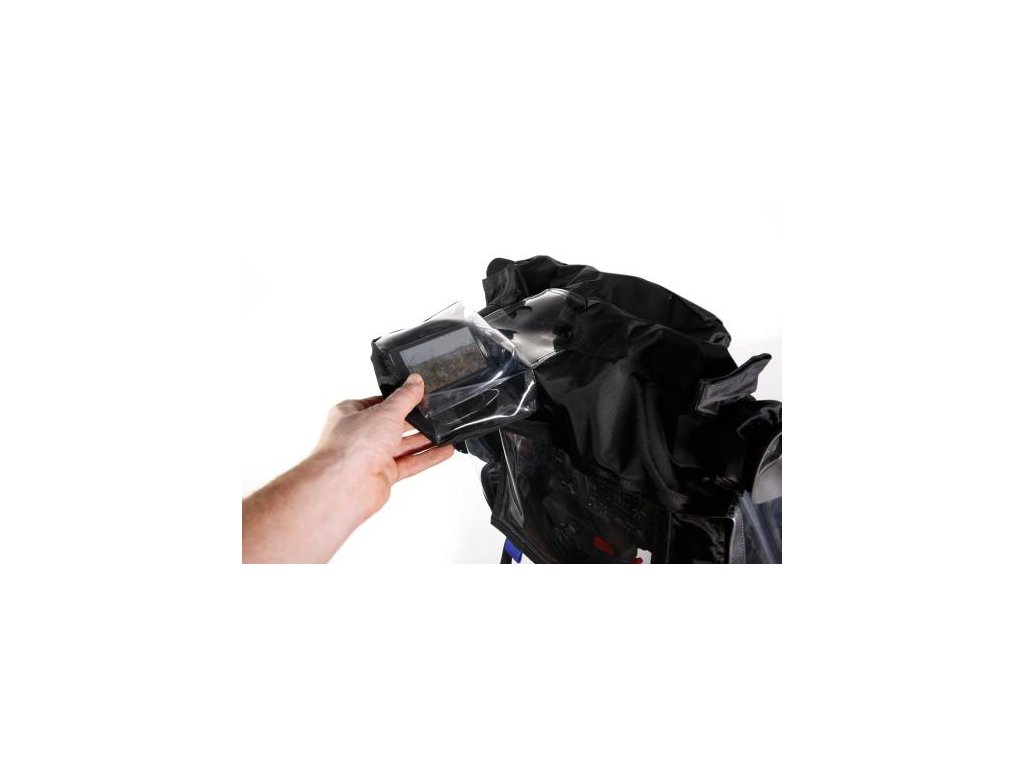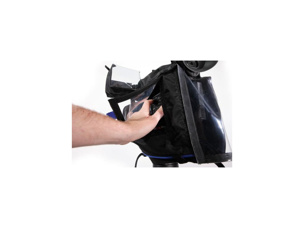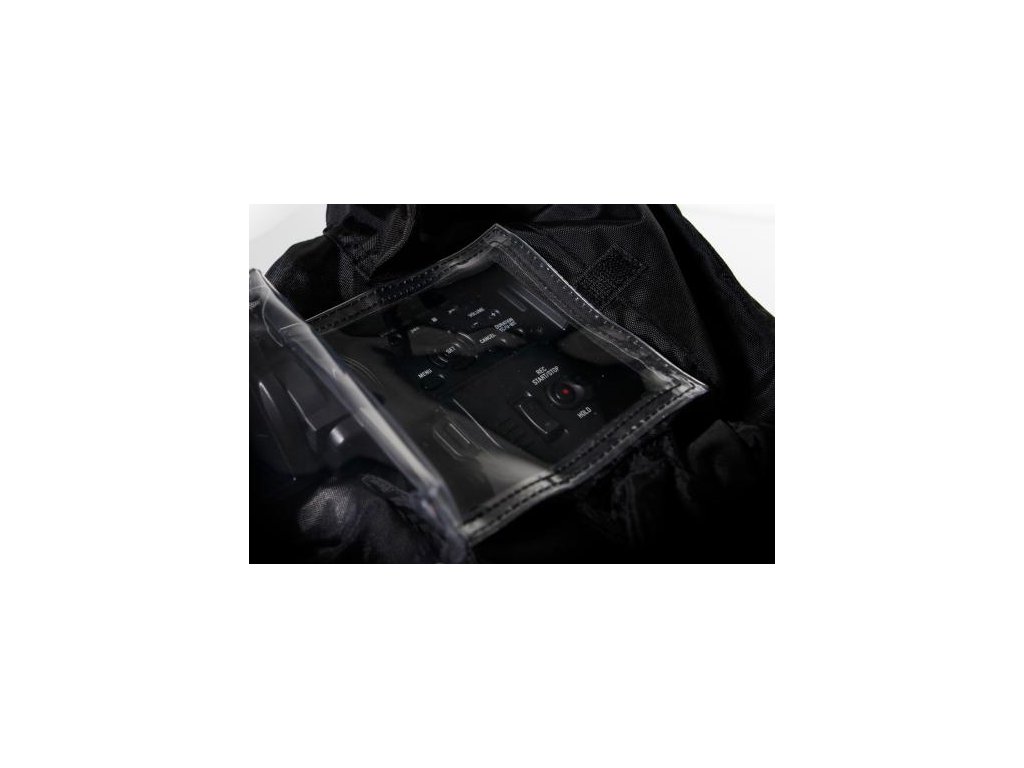 Datorită benzii de cauciuc cu o lungime de 48 cm (18,9”), haina de ploaie se potrivește corect pe lentilele fixe și parasolarul. Cureaua cu velcro furnizată vă permite să strângeți parasolarul peste parasolar, dar vă permite totuși să controlați obiectivul datorită designului său spațios. Datorită mai multor deschideri cu fermoar și velcro, puteți accesa cu ușurință toate părțile esențiale ale camerei. De la găuri pentru conectorii MI, antene wireless, microfoane și vizor până la o fereastră transparentă pe partea laterală a monitorului LCD, această haină de ploaie are totul. Spatele transparent al capacului se deschide cu ușurință pentru a schimba bateria camerei sau pentru a obține acces rapid la cabluri.
