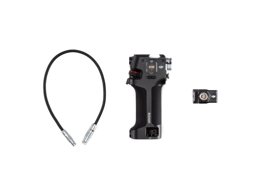 Mânerul de control legat DJI Ronin oferă un control avansat cu fir al focalizării și al parametrilor camerei, declanșatorul camerei și mișcarea stabilizatorului.