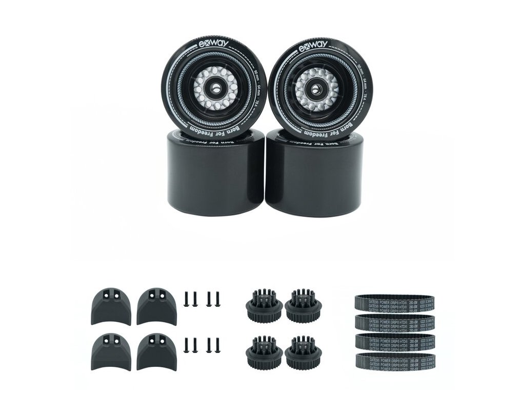 Diametru 90 mm, latime suprafata de contact 64 mm. Duritate 78A. Setul include: 4x roți de 90 mm, 4x curele (Abt-15W280P), 4x adaptoare roți (AP-12H16W36T), 4x capac motor (Abc-A1W), 8x șuruburi, 8x rulment.Parametri suplimentari
