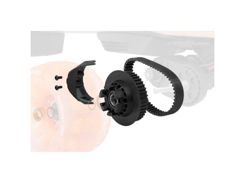 Set de asamblare pentru roți Cloud de 120 mm pentru longboardul Exway Flex Riot. 2x adaptor pentru roată (AP-6H16W44T), 2x curea (ABT-15W280P), 2x capac motor (ACV-44TCF1)