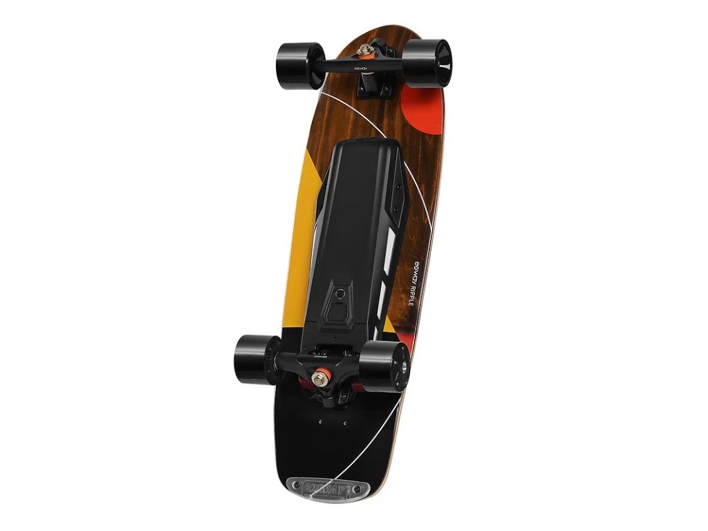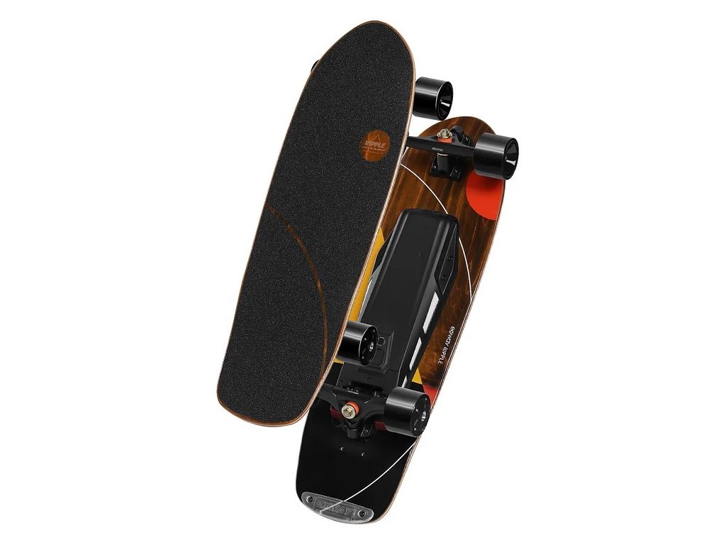 Exway Ripple este un skateboard electric conceput și produs de Exway, o companie specializată în vehicule electrice inovatoare. Exway Ripple este un skateboard compact și ușor, care oferă o plimbare lină și rapidă. Skateboard-ul este echipat cu un motor electric puternic care vă permite să atingeți viteze mari și să porniți rapid. De asemenea, are un sistem avansat de frânare care permite oprirea lină și sigură a skateboard-ului. Skateboard-ul este, de asemenea, echipat cu o telecomandă funcțională care permite controlul ușor al vitezei și frânării. Controlerul este intuitiv și ușor de utilizat cu gesturi simple.