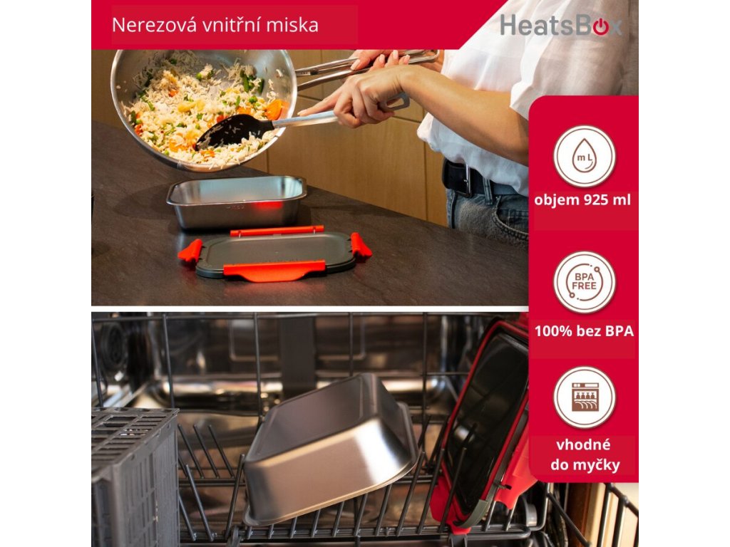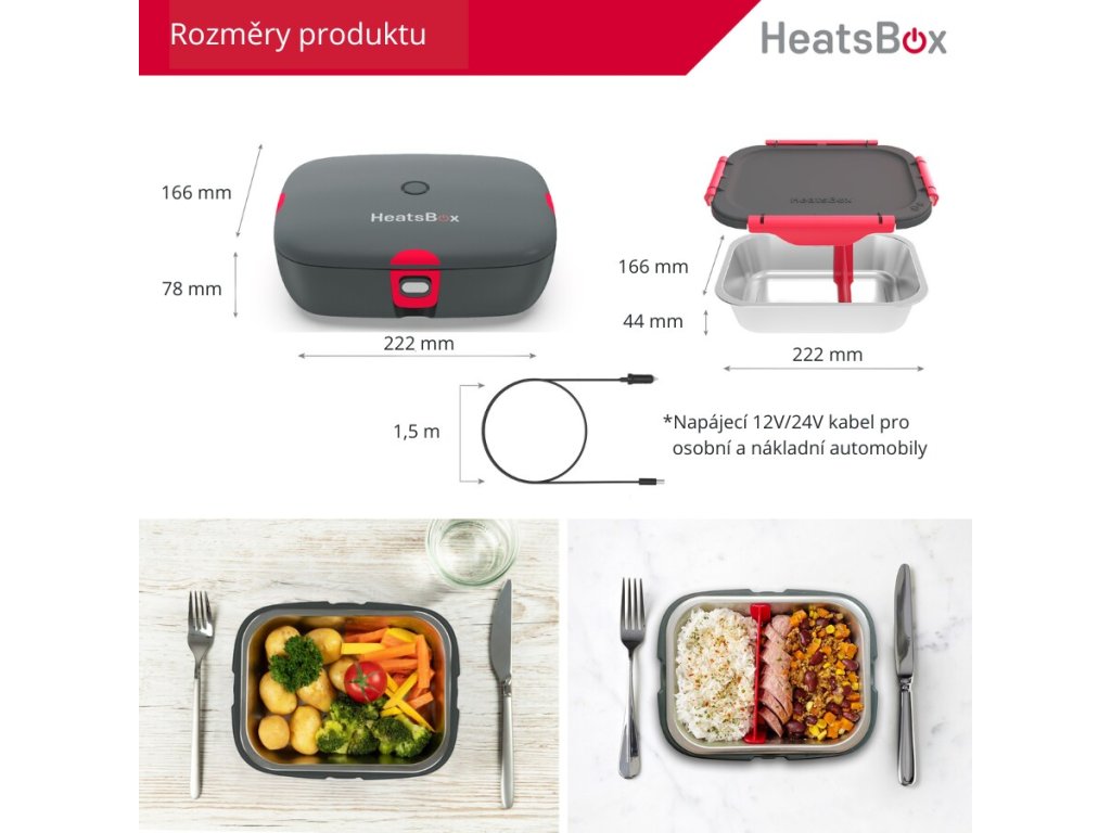 Mulțumiridesign minimalist și întreținere ușoară HeatsBox va deveni partenerul tău ideal de zi cu zi. Va fi de folos șoferilor profesioniști, în timpul unei călătorii de afaceri, al unei vacanțe de vară, al unei excursii sau al unei călătorii cu cortul. Greutatea cutiei în sine nu ajunge nici măcar la un kilogram și cu puțin spațiu în valiză sau rucsac, te poate însoți oriunde. În ciuda dimensiunilor sale compacte, poate conține aproape 600 g de porții! HeatsBox DRIVE este echipat cu un bol interior detașabil și un separator, ceea ce te va ajuta să separi felul principal de garnitură. În plus, puteți achiziționa boluri separate suplimentare și astfel puteți fi echipat cu posibilitatea de a servi mese calde în cadrul unei familii mai mari sau, de exemplu, al unei echipe de lucru.