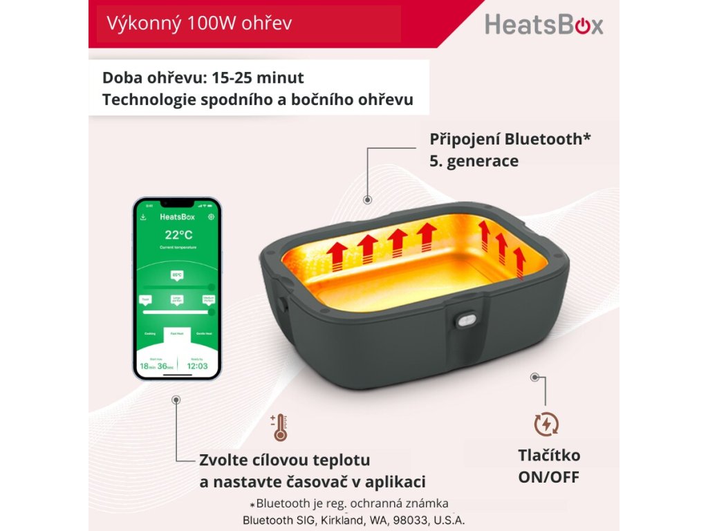 Cutia inteligentă de prânz funcționează împreună cu cu aplicația HeatsBox însoțitoare, pe care o puteți descărca gratuit atât pentru dispozitive iOS, cât și pentru Android.Aplicația vă oferă opțiunea pornirea încălzirii, dar și alte opțiuni de setare extinse, ceea ce va face experiența utilizatorului mai plăcută. Pe lângă ora și temperatura țintă de încălzire, puteți seta, de exemplu,cronometru. HeatsBox DRIVE va începe apoi automat încălzirea delicatesei, astfel încât aceasta să fie gata la ora selectată. De asemenea, puteți controla cutia offline folosind butonul START/STOP situat direct pe dispozitiv. Parametrii de încălzire necesari sunt stocați în acesta.
