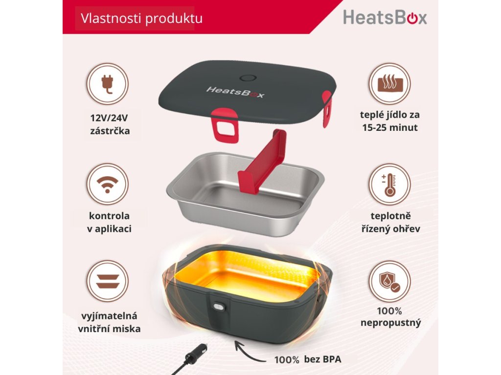 HeatsBox DRIVE este fabricat din materiale de înaltă calitate, care vor rezista mult timp, la fel de bune ca noi și nu vor reprezenta niciun risc pentru sănătatea dumneavoastră atunci când manipulați alimente. Toate materialele și produsul în sine au trecut mai multe teste de siguranță alimentară și nu dețin nicio certificare importantă. Siguranța dumneavoastră este, de asemenea, monitorizată senzor de temperatură. Aceasta verifică dacă, atunci când este conectat la o sursă de alimentare cutia nu se supraîncălzeșteși astfel previne riscul de incendiu sau arsuri. Totuși, fiți atenți când manipulați HeatsBox și lăsați întregul dispozitiv să se răcească o perioadă înainte de a scoate bolul interior. Bol interior, cu care alimentele sunt în contact direct, este fabricat din oțel inoxidabil. Poate fi spălat în siguranță în mașina de spălat vase.sau pur și simplu în chiuvetă alături de celelalte vase. Nici restul dispozitivului nu necesită întreținere specială. Ștergeți-l rapid cu o cârpă umedă.Rezumatul proprietăților