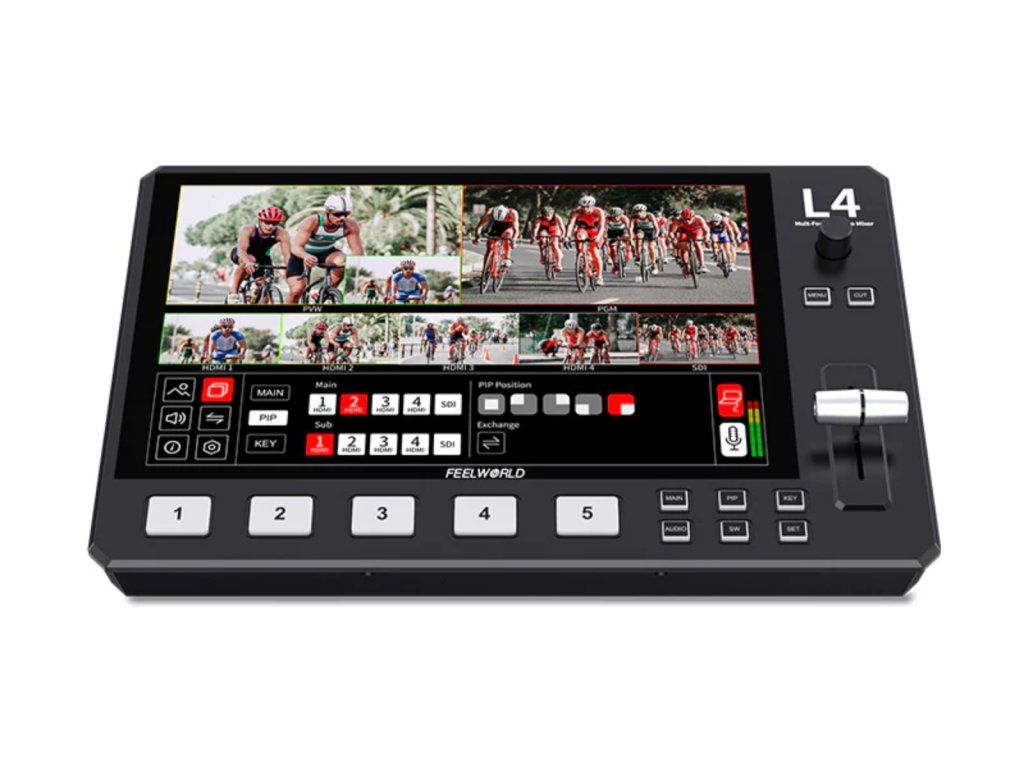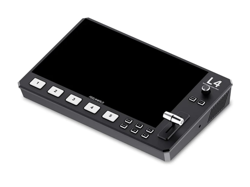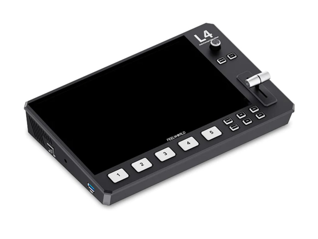 Video Switcher FEELWORLD L4 este un instrument versatil conceput pentru producții live profesionale cu mai multe camere. Cu 4 intrări HDMI și 1 SDI, poate găzdui până la 5 surse de semnal, făcându-l ideal pentru evenimente mari și transmisii live. Interfața sa intuitivă, ecranul tactil de 10,1 inchi și o serie de funcții, inclusiv cheia cromatică, suprapunerea logo-ului și efectele de tranziție, oferă utilizatorilor control creativ. Indiferent dacă sunteți un profesionist experimentat sau un începător, funcționalitatea plug-and-play, designul robust și streamingul USB 3.0 îl fac accesibil oricui doresc să-și îmbunătățească conținutul video și prezentările, fie pentru streaming online, fie pentru aplicații de afaceri.