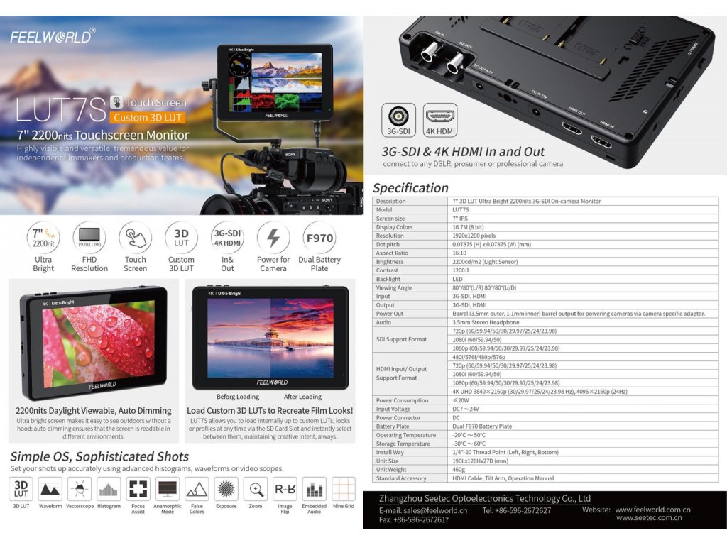 Monitor de cameră de 7" cu luminozitate ridicată (2200 cd/m2, inclusiv senzor de lumină ambientală pentru reglarea automată a luminozității), ecran tactil și suport pentru corecții 3D LUT (presetarea integrată „Log to Rec.709” sau import de fișiere .cube personalizate) Furnizat cu un set de fișiere „Retrofit” Mini/Micro HDMI-HDMI cablu și suport de montare. Varianta LUT7S cu 4K HDMI și I/O 3G-SDI.